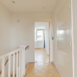 Overloop, grote slaapkamer aan de voorzijde gelegen. De ruime badkamer is centraal gelegen en bereikbaar vanaf de overloop. De badkamer is voorzien van een wastafel, een toilet, een douchecabine en wasmachineaansluiting. De tweede slaapkamer met (deels) afgesloten kastenkamer bevinden zich aan de achterzijde. De mogelijkheid bestaat om een extra (slaap)kamer te creëren.