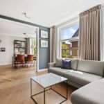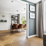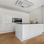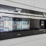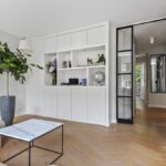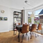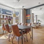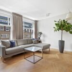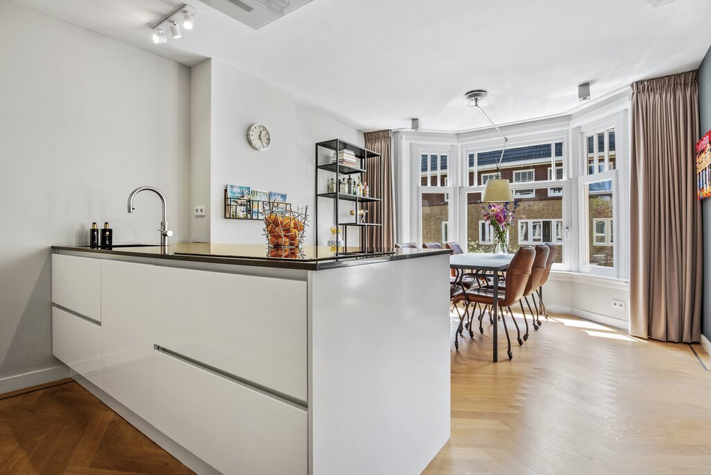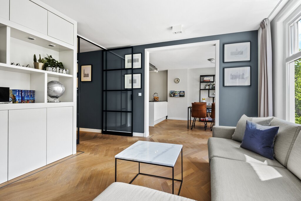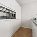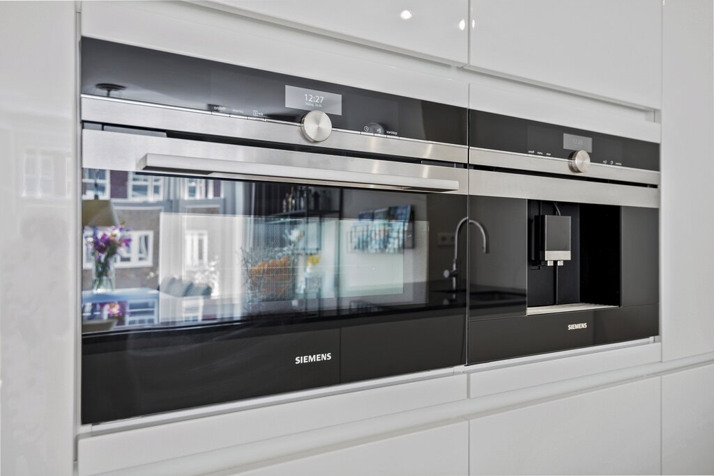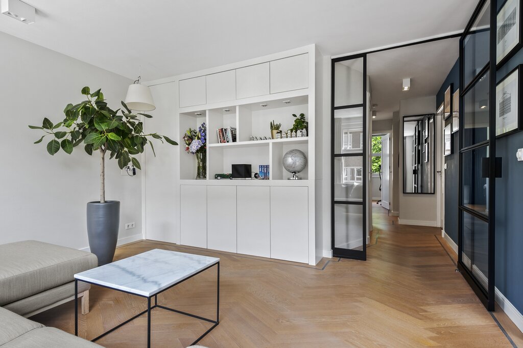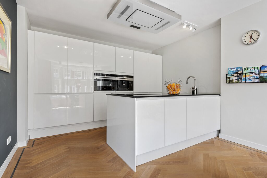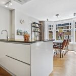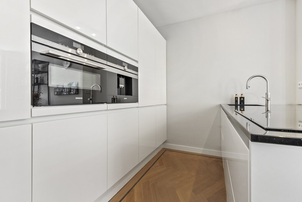 De woonkamer, gelegen aan de voorzijde, strekt zich over de volledige breedte van het appartement en is een heerlijke lichte leefruimte. De luxe open keuken is voorzien van hoogwaardige inbouwapparatuur, waaronder een koffiemachine, combi-oven en Quooker, en vormt een prachtige verbinding met de woonkamer.