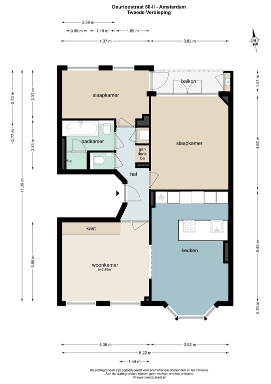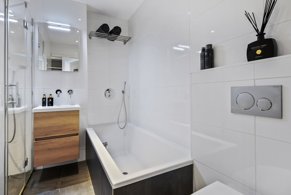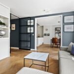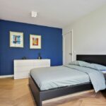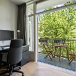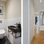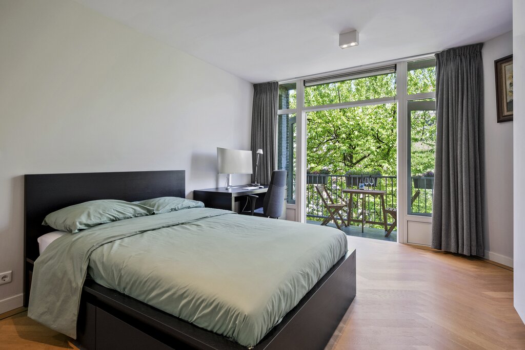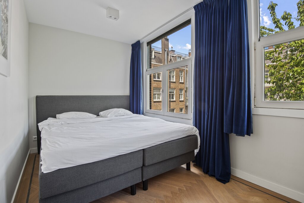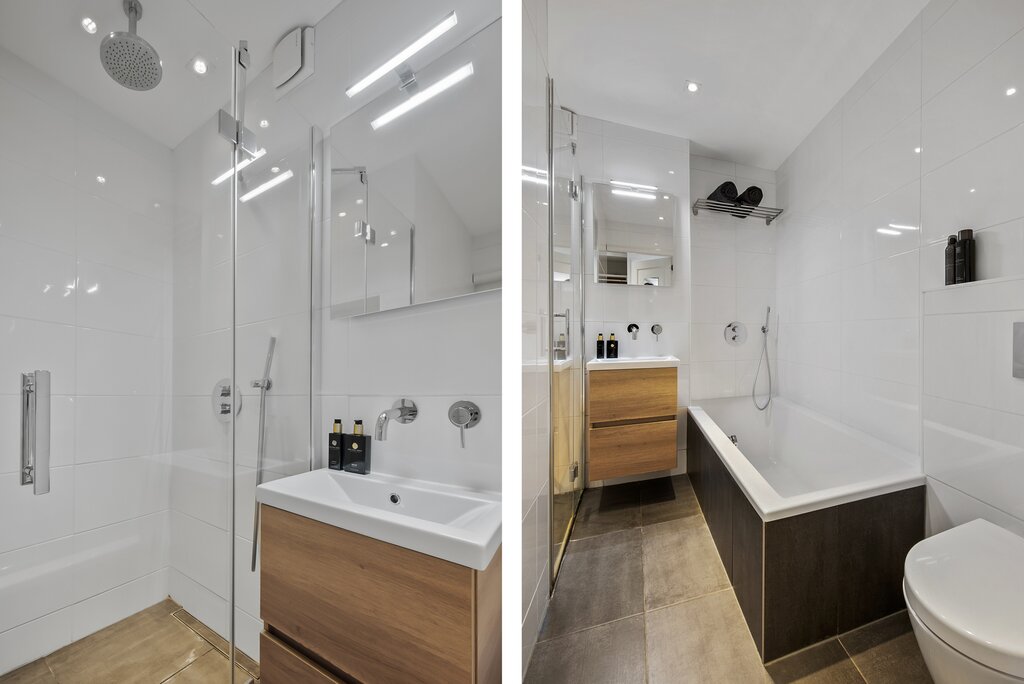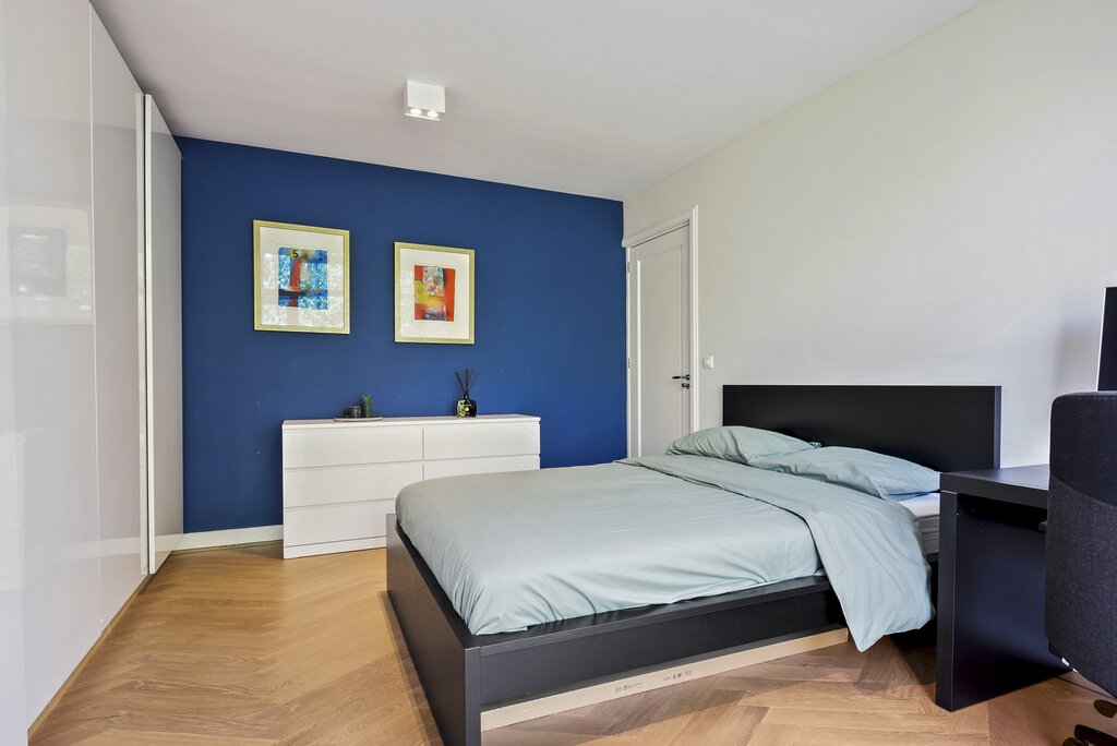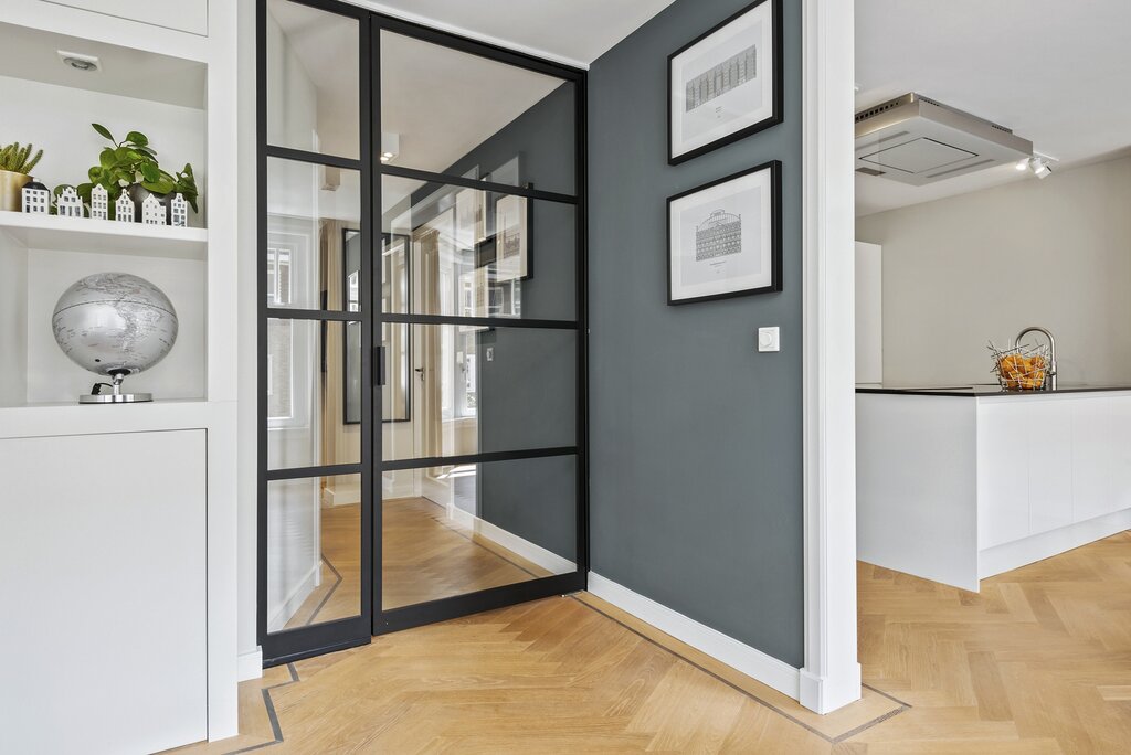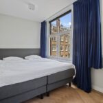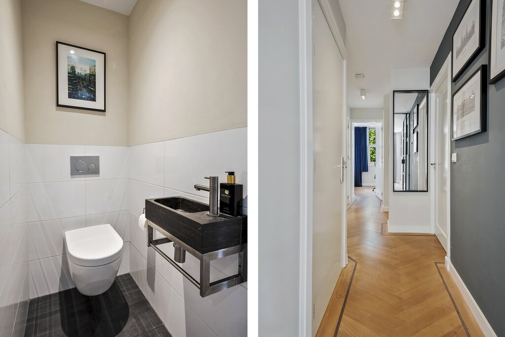 Aan de achterzijde liggen twee slaapkamers van circa 18 m² en 9 m², rustig en licht door de dubbele beglazing. De badkamer is luxe uitgevoerd met een inloopregendouche, bad en wastafel, terwijl het separate toilet extra comfort biedt. Het hele appartement is voorzien van een mooie visgraatvloer en subtiele raambekleding, wat bijdraagt aan de hoogwaardige afwerking.