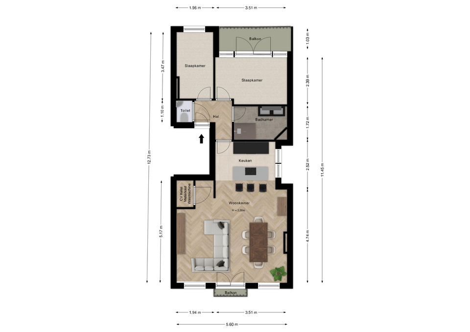 Voor een mogelijke indeling met o.a. 2 slaapkamers verwijzen wij graag naar de alternatieve plattegrond.