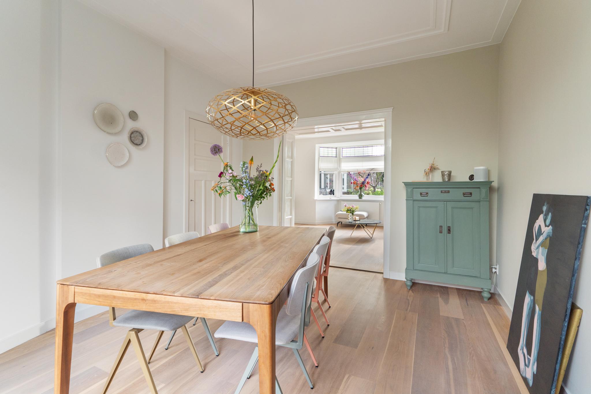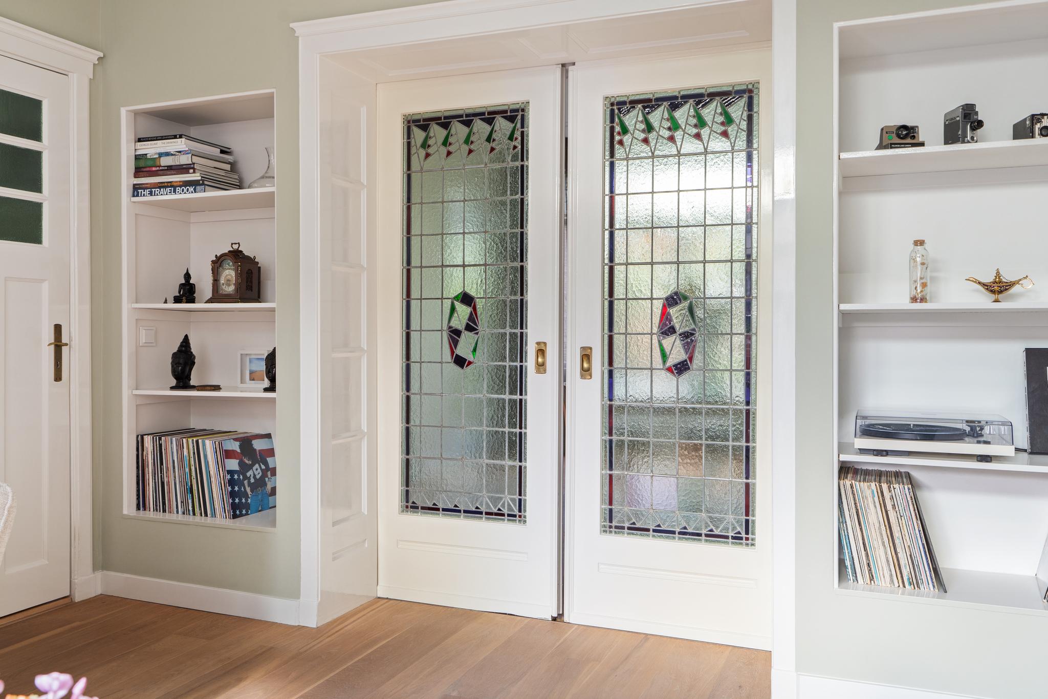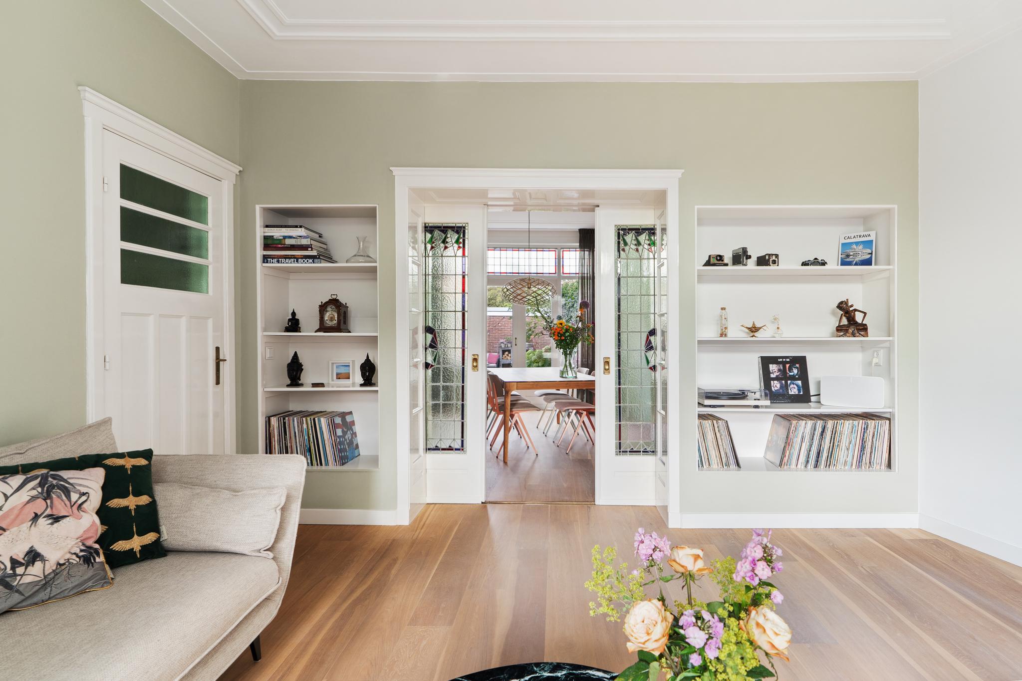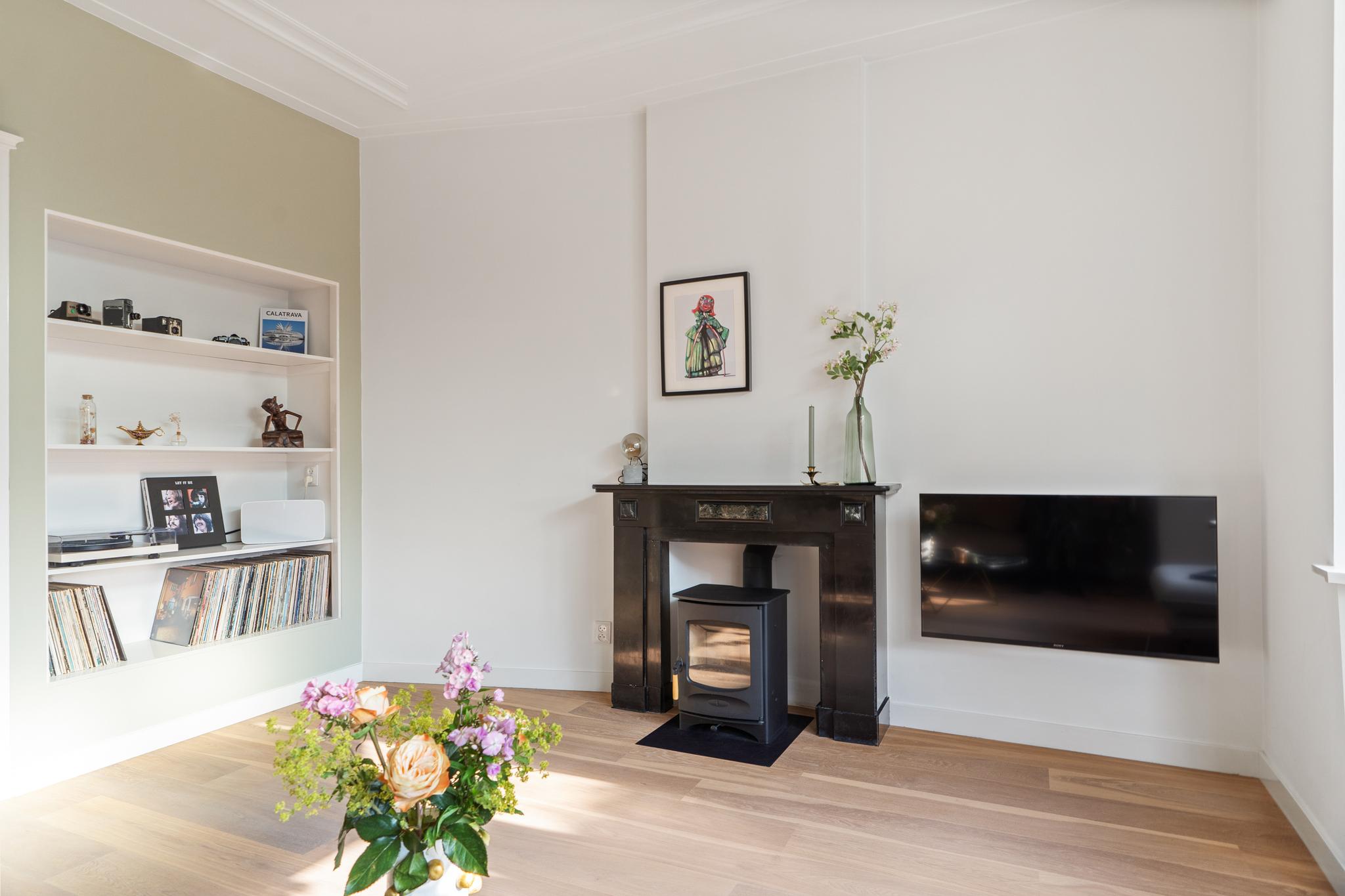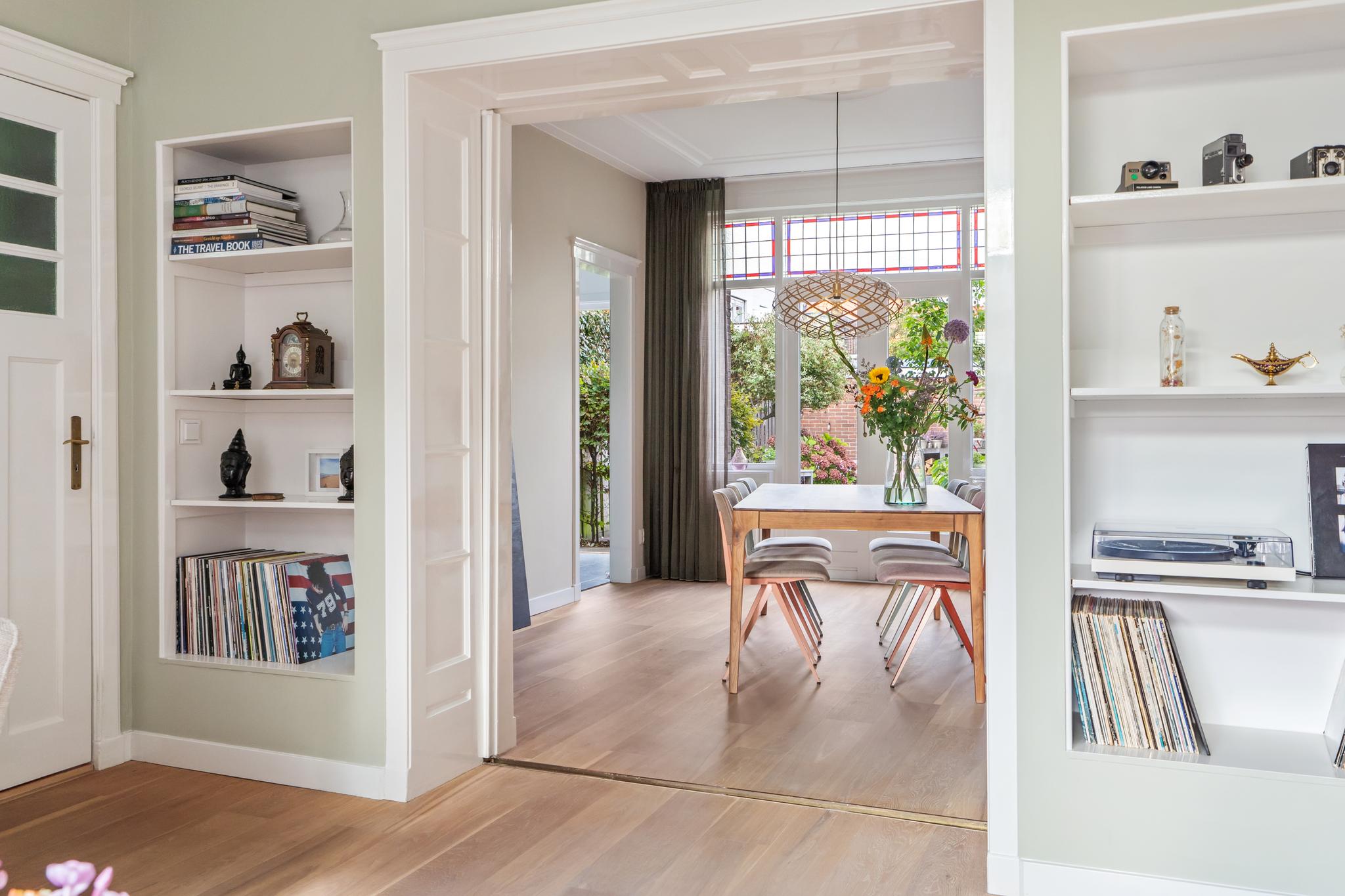 Vestibule met garderoberuimte. Hal voorzien van trapkast en separaat toilet. Lichte kamer ensuite met zitgedeelte aan de voorzijde en een eetgedeelte aan de achterzijde. Diverse inbouwkasten en fraaie schuifdeuren met glas-in-lood. De zitkamer beschikt over een houtkachel. De keuken is aan de achterzijde van de woning en voorzien van o.a. een Quooker, een inductie kookplaat met geïntegreerde afzuiging, een combi oven/magnetron, een vaatwasser en een koel/vries combi. De tuin is vanuit de keuken te bereiken en middels openslaande deuren vanuit de eetkamer. De tuin meet circa 54 m² en heeft een achterom.