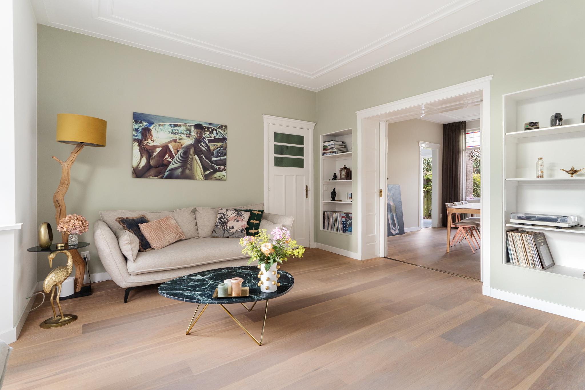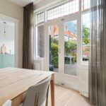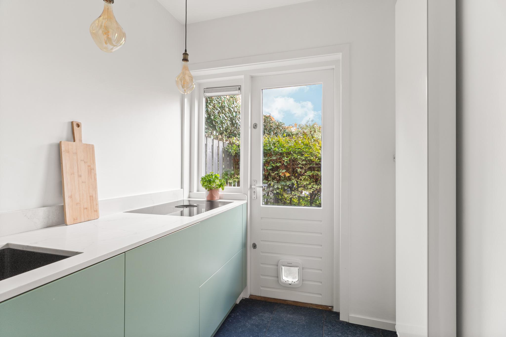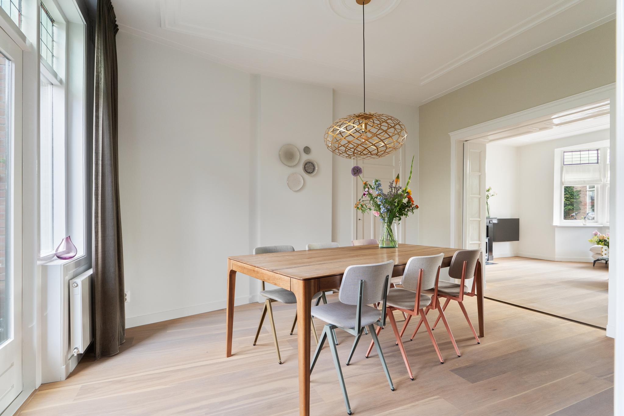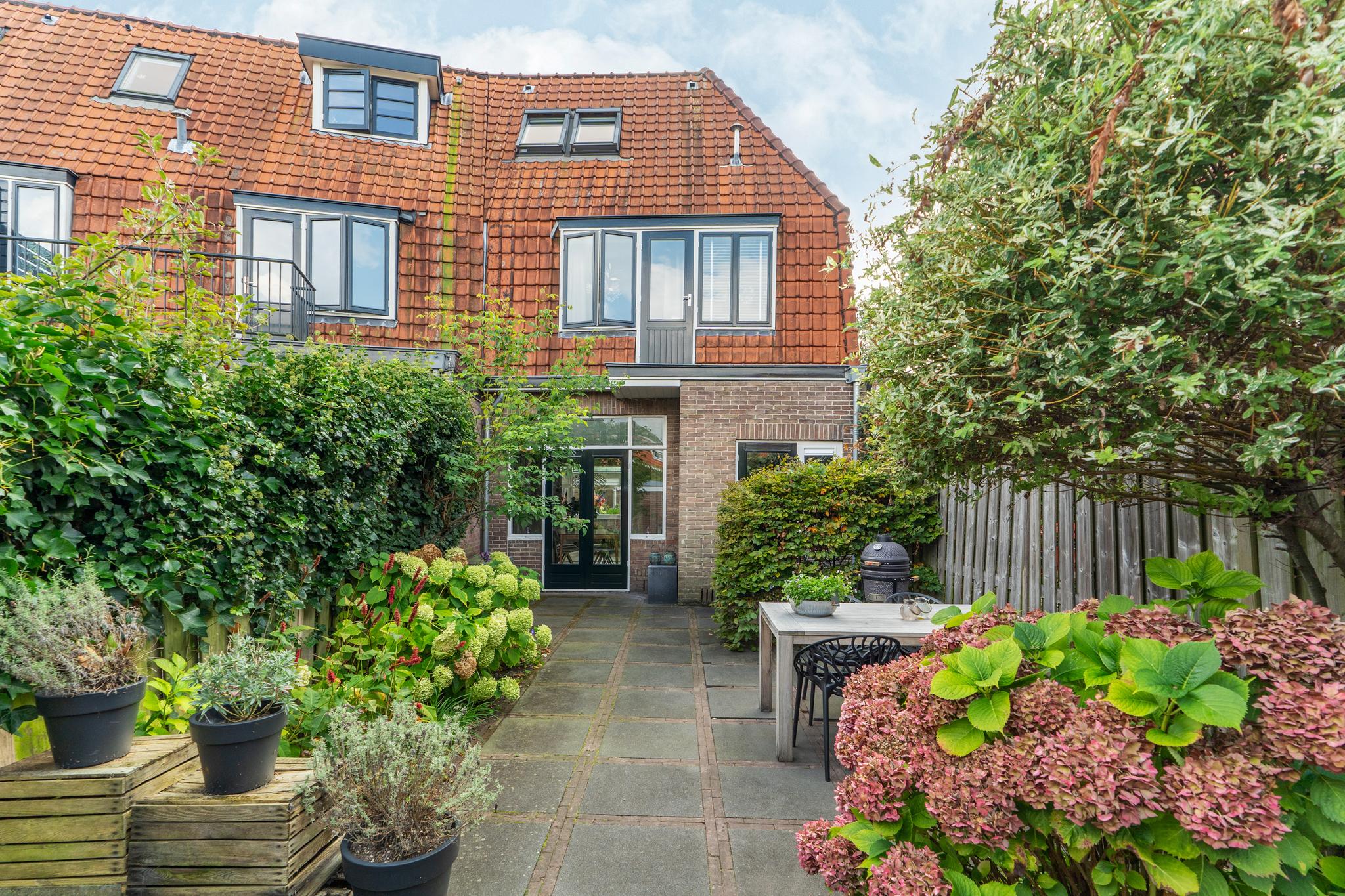 Vestibule met garderoberuimte. Hal voorzien van trapkast en separaat toilet. Lichte kamer ensuite met zitgedeelte aan de voorzijde en een eetgedeelte aan de achterzijde. Diverse inbouwkasten en fraaie schuifdeuren met glas-in-lood. De zitkamer beschikt over een houtkachel. De keuken is aan de achterzijde van de woning en voorzien van o.a. een Quooker, een inductie kookplaat met geïntegreerde afzuiging, een combi oven/magnetron, een vaatwasser en een koel/vries combi. De tuin is vanuit de keuken te bereiken en middels openslaande deuren vanuit de eetkamer. De tuin meet circa 54 m² en heeft een achterom.