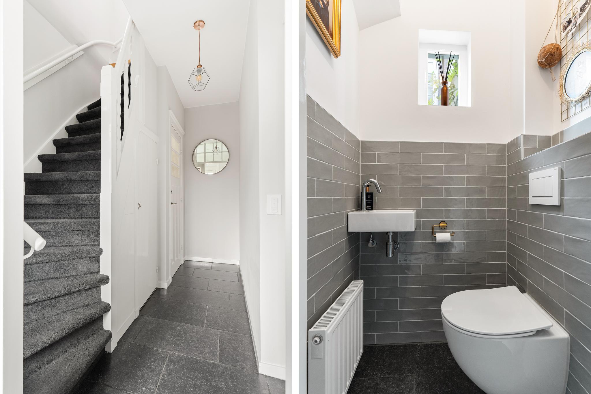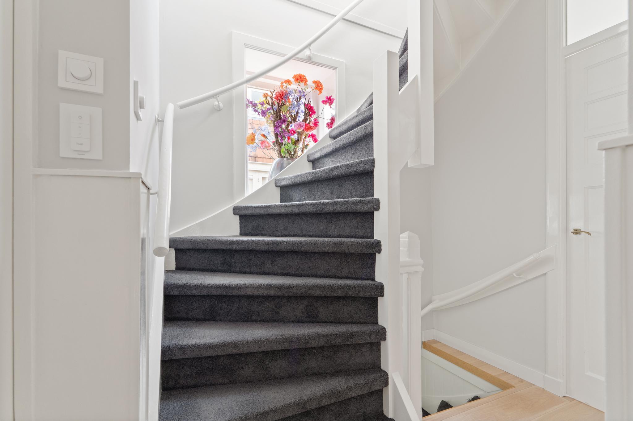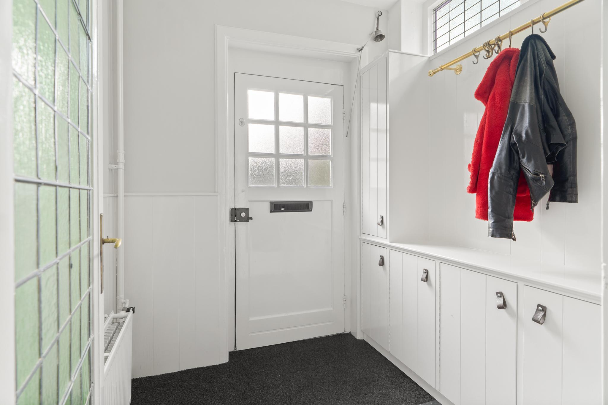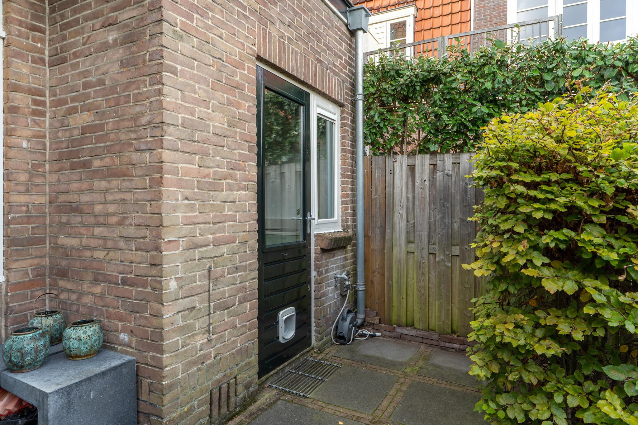 Vestibule met garderoberuimte. Hal voorzien van trapkast en separaat toilet. Lichte kamer ensuite met zitgedeelte aan de voorzijde en een eetgedeelte aan de achterzijde. Diverse inbouwkasten en fraaie schuifdeuren met glas-in-lood. De zitkamer beschikt over een houtkachel. De keuken is aan de achterzijde van de woning en voorzien van o.a. een Quooker, een inductie kookplaat met geïntegreerde afzuiging, een combi oven/magnetron, een vaatwasser en een koel/vries combi. De tuin is vanuit de keuken te bereiken en middels openslaande deuren vanuit de eetkamer. De tuin meet circa 54 m² en heeft een achterom.