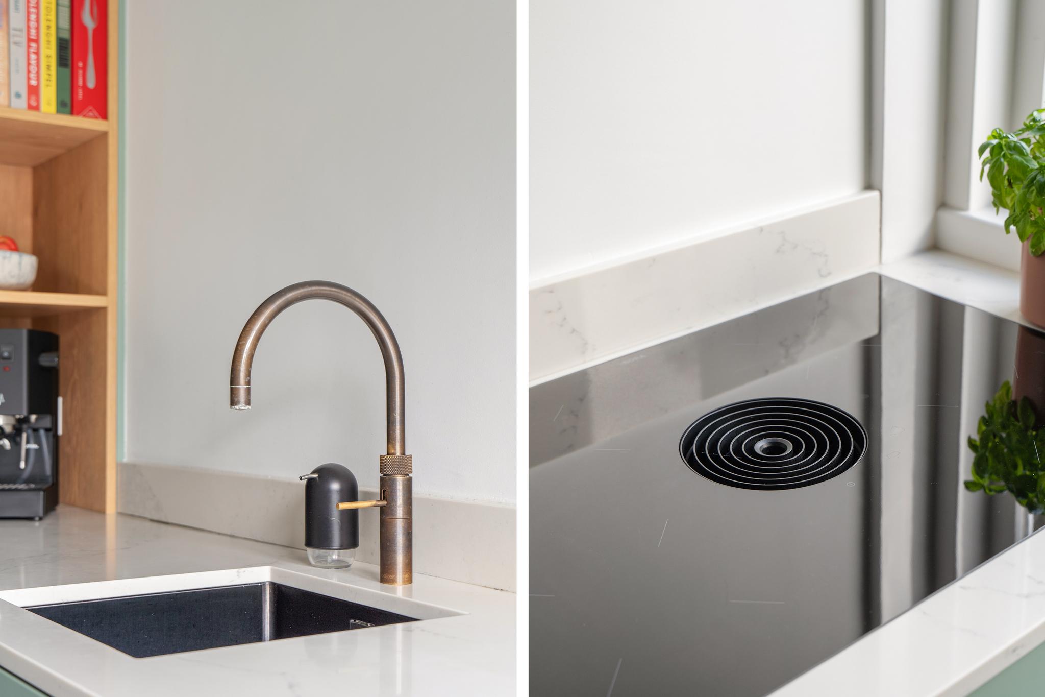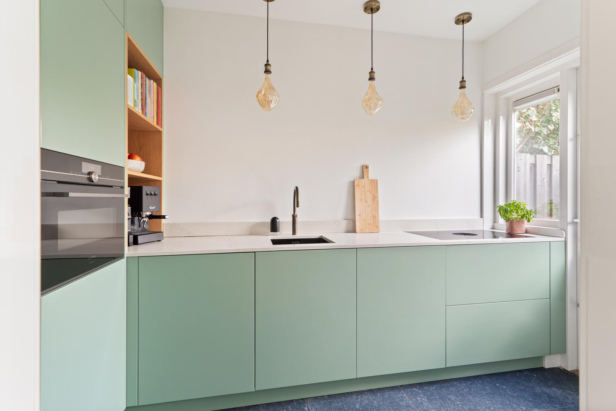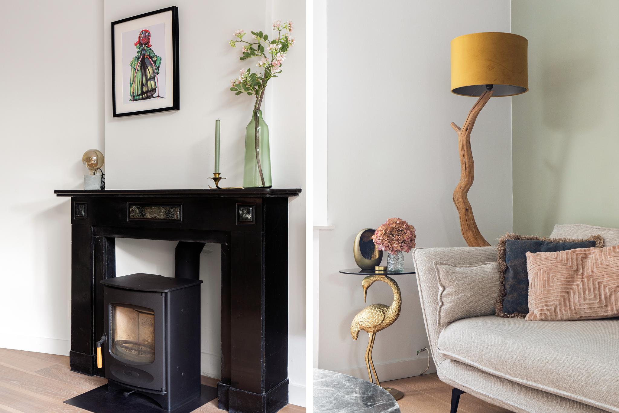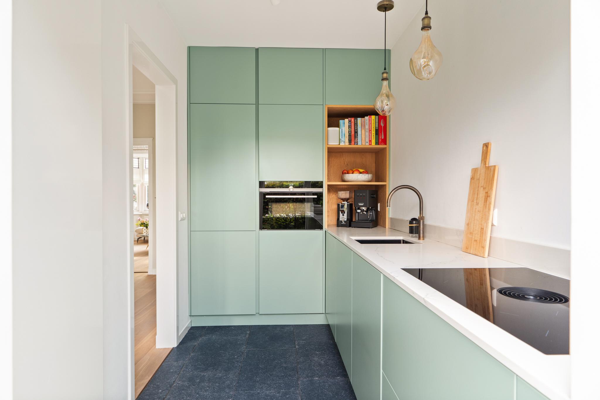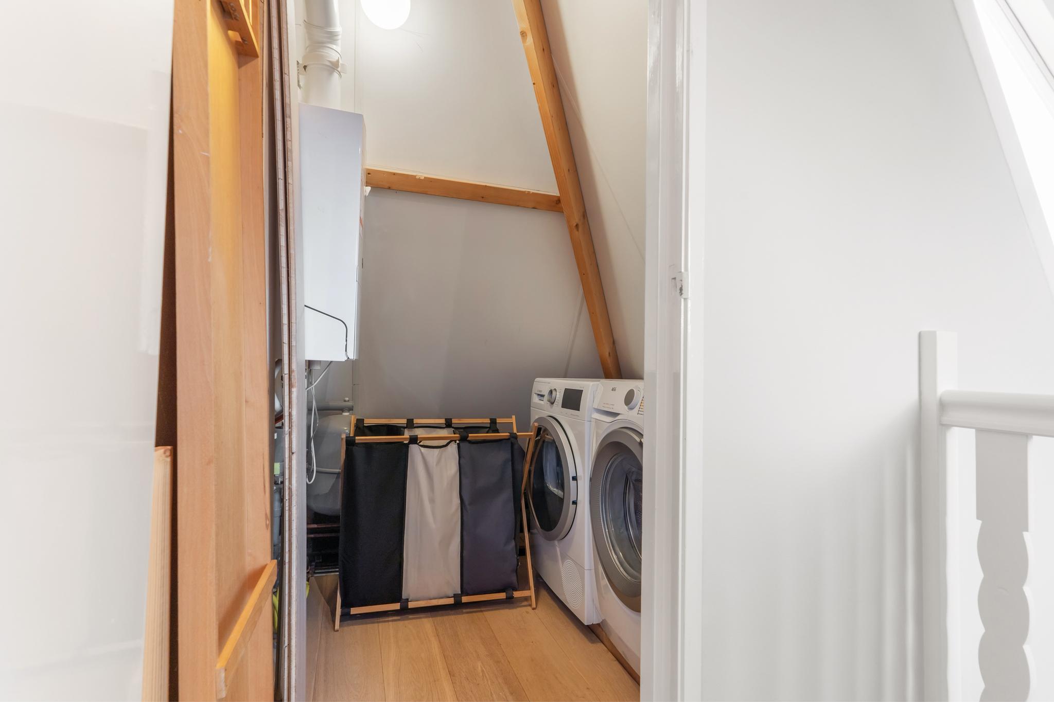 Vestibule met garderoberuimte. Hal voorzien van trapkast en separaat toilet. Lichte kamer ensuite met zitgedeelte aan de voorzijde en een eetgedeelte aan de achterzijde. Diverse inbouwkasten en fraaie schuifdeuren met glas-in-lood. De zitkamer beschikt over een houtkachel. De keuken is aan de achterzijde van de woning en voorzien van o.a. een Quooker, een inductie kookplaat met geïntegreerde afzuiging, een combi oven/magnetron, een vaatwasser en een koel/vries combi. De tuin is vanuit de keuken te bereiken en middels openslaande deuren vanuit de eetkamer. De tuin meet circa 54 m² en heeft een achterom.