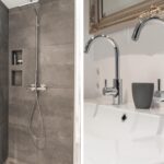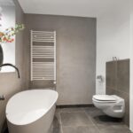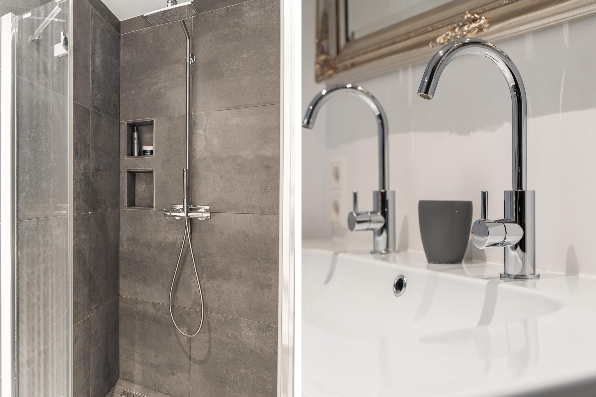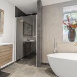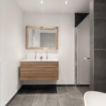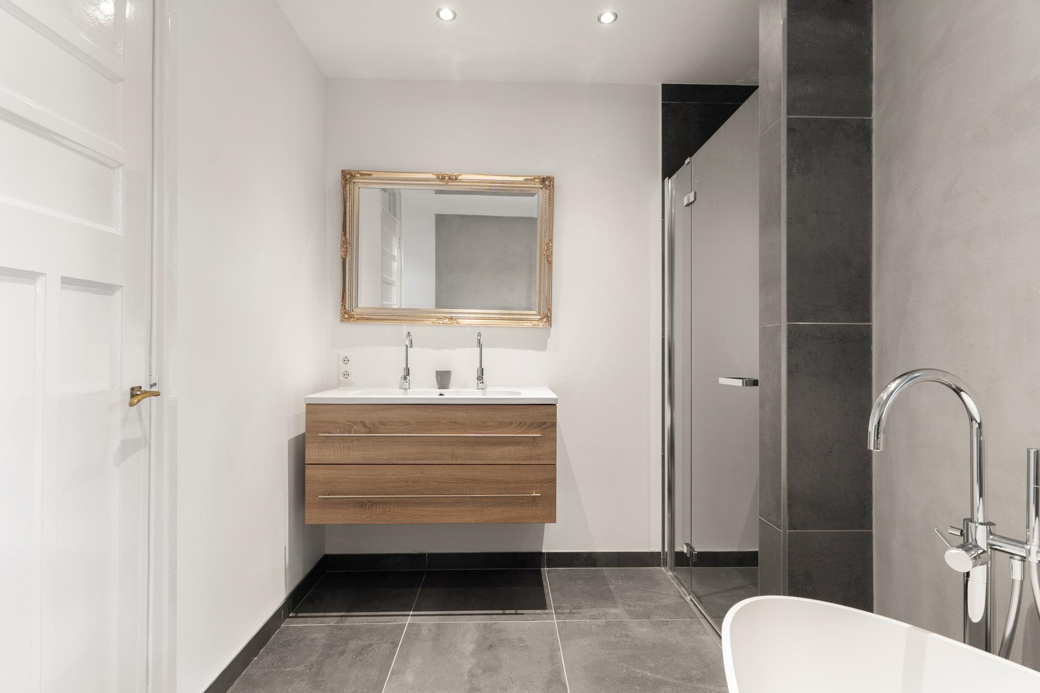 - Badkamervoorzieningen Ligbad, toilet, dubbele wastafel, wastafelmeubel, inloopdouche, toilet, wastafelmeubel, inloopdouche