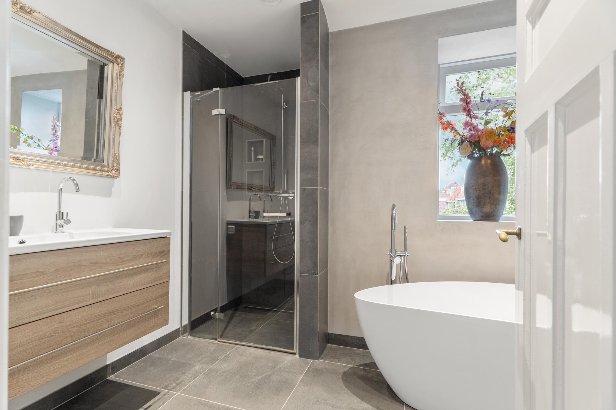 Overloop, 3 slaapkamers van circa 15 m² (4.11 x 3.56 m, achterzijde), circa 14 m² (3.80 x 3.75 m, voorzijde) en circa 6 m² (3.17 x 1.86 m, achterzijde). De badkamer is bereikbaar vanaf de overloop en voorzien van een wastafelmeubel met 2 mengkranen, een inloopdouche, een vrijstaand bad, een toilet en diverse plafond inbouwspots.