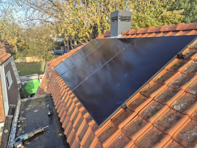 Recent zijn drie zonnepanelen geplaatst op het dak. Panelen van 475 Wp, die samen 1375 Wp vermogen hebben, goed voor ruim 1300 kWh per jaar.