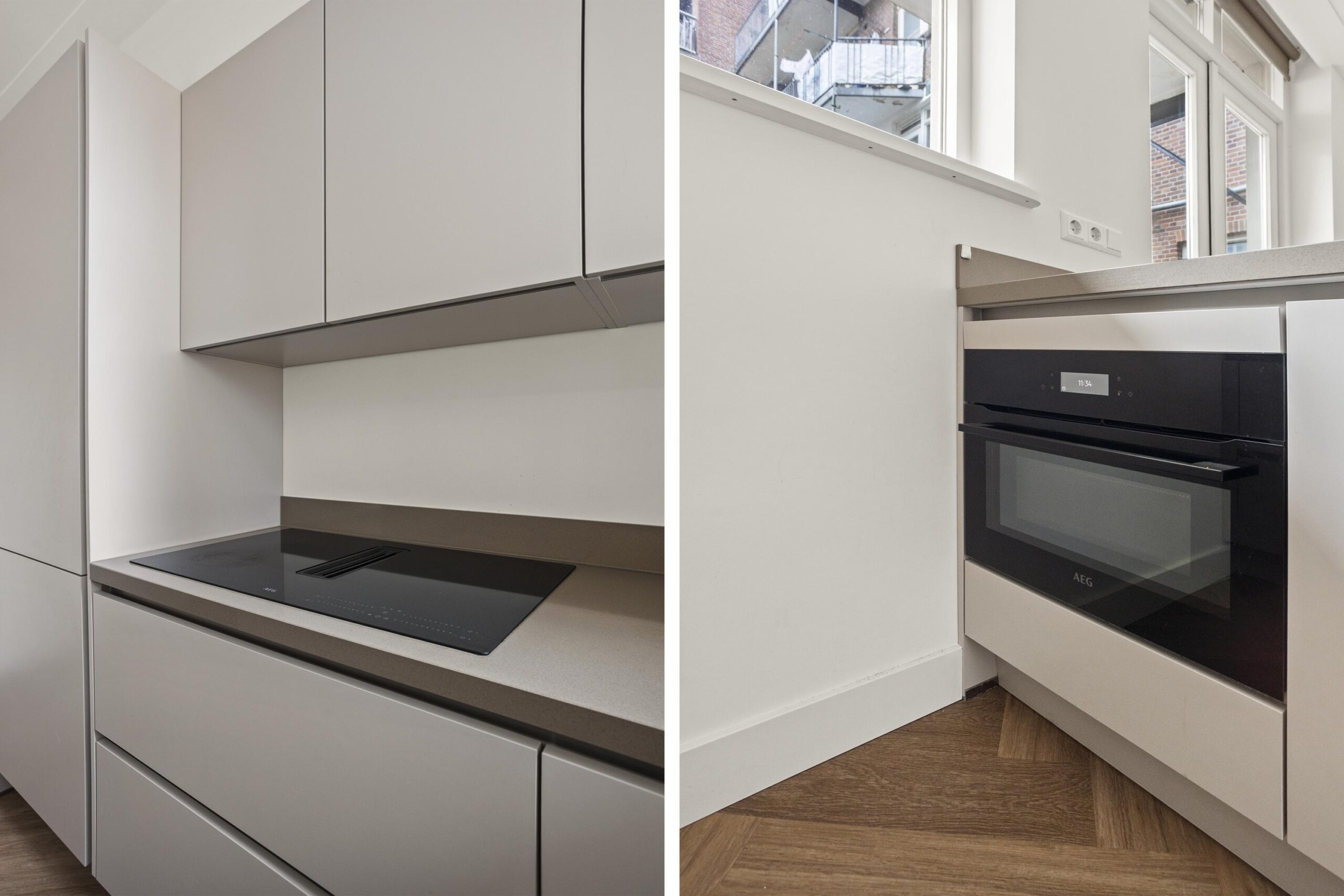 De keuken is luxe uitgevoerd en uitgerust met hoogwaardige AEG-inbouwapparatuur. Zo beschikt de keuken onder andere over een spoeleiland, een inductiekookplaat met geïntegreerde afzuiging, een oven-magnetroncombinatie, een vaatwasser en een koelkast met vriezer. Aangrenzend aan de keuken bevindt zich een externe berging met een aansluiting voor de wasmachine. In de hal bevindt zich tevens een separaat toilet.