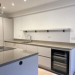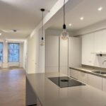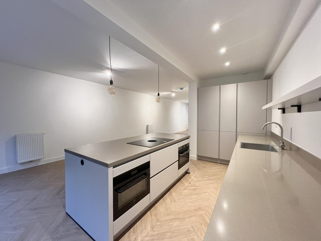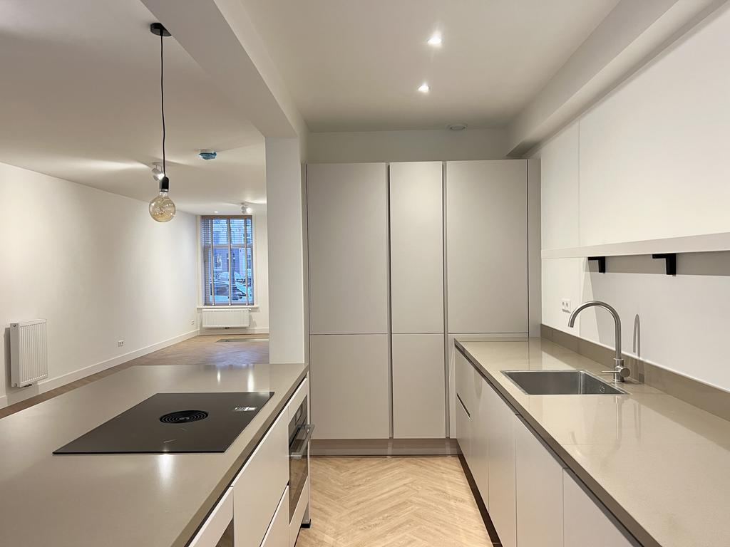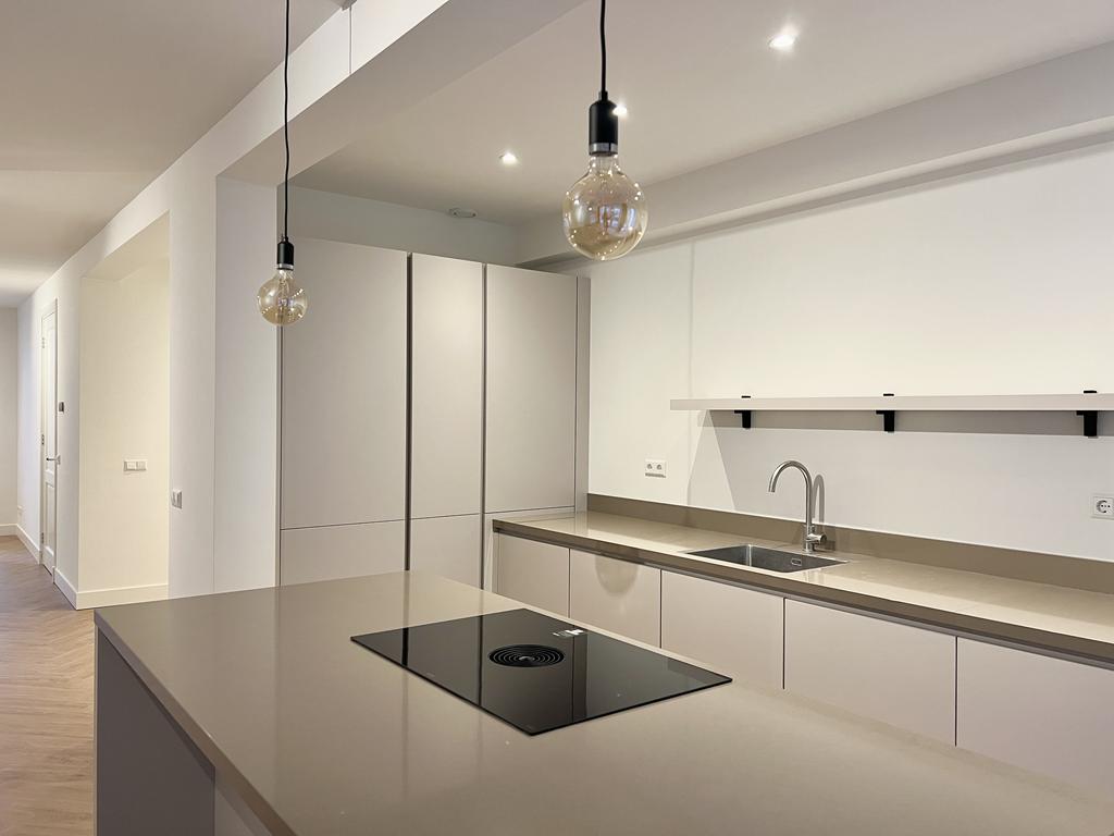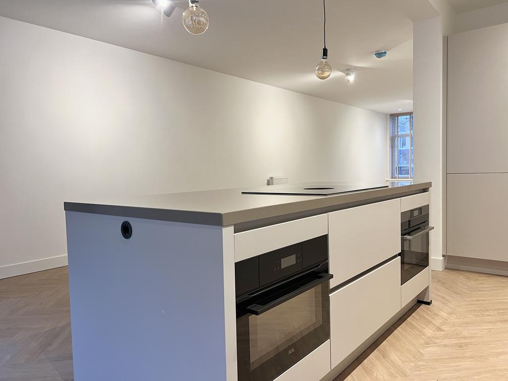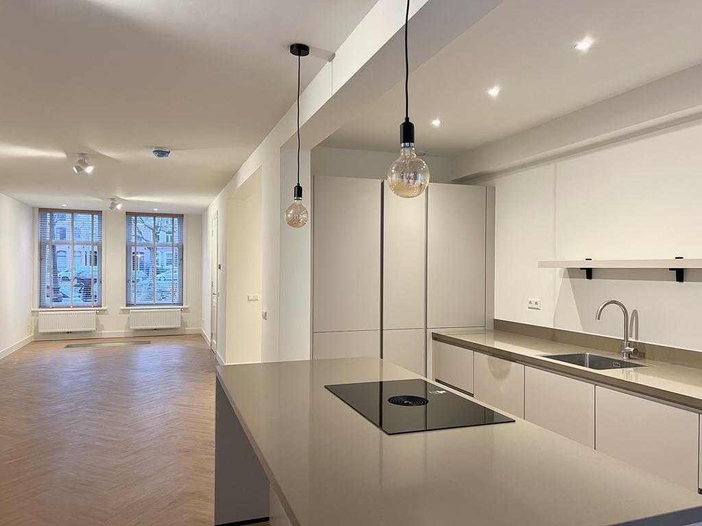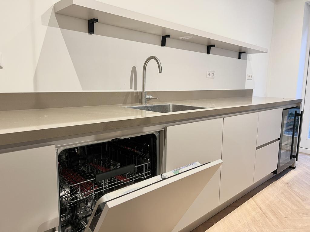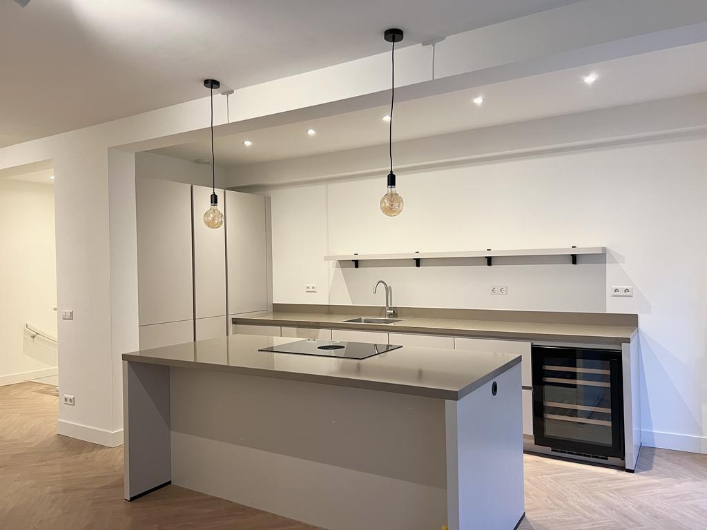 Through the entrance at street level you reach the entrance of the apartment. The spacious hall gives access to the living room and the separate toilet. Through the hall you reach the very spacious living room at the front. At the back of the apartment is the luxurious open kitchen with cooking island including beautiful pendant light. The handle-less kitchen is equipped with a 4-burner induction hob with built-in extractor, a refrigerator, freezer, dishwasher, wine cooler, combi oven/microwave and a stone worktop. All kitchen appliances are AEG brand. From the living room and the kitchen you have access to the spacious garden of approximately 51 m² (5.7 x 9 m).