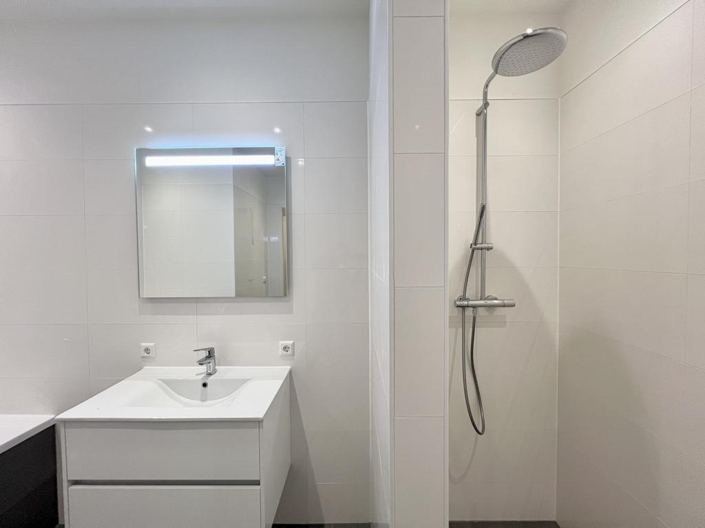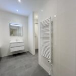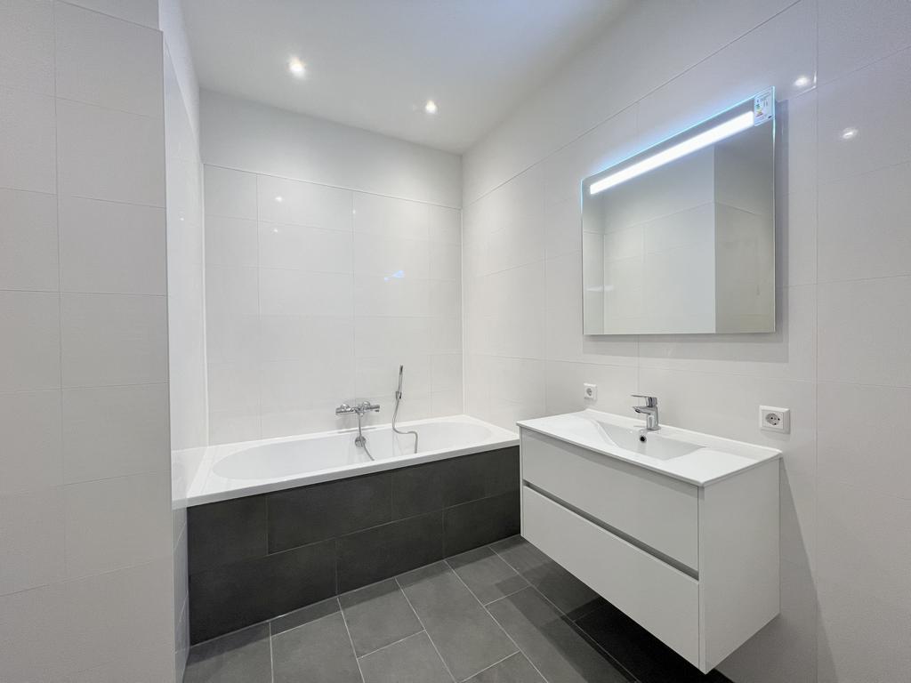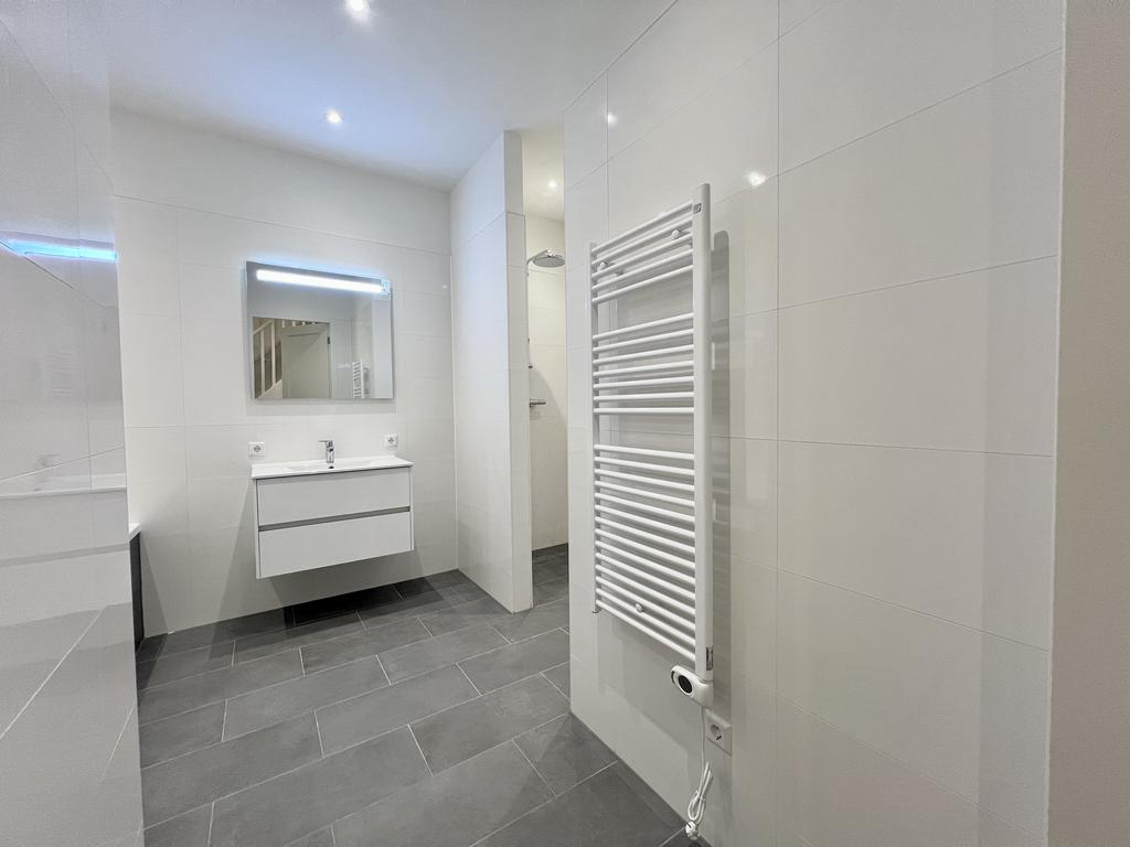 Also on this floor is a luxurious bathroom equipped with bathtub, walk-in shower, double sink with storage drawers, a bathroom mirror and a design radiator. The toilet and laundry room are located in a separate room.
