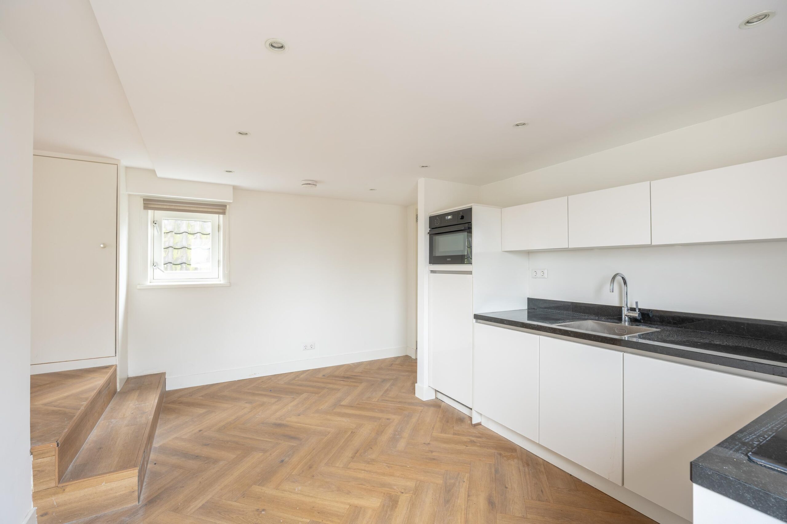 De (woon)kamer aan de voorzijde heeft een plafondhoogte van circa 1.75 m onder de balk en circa 1.85 m tussen de balken. De keuken, slaapkamer en badkamer hebben een plafondhoogte van circa 2.10 m.