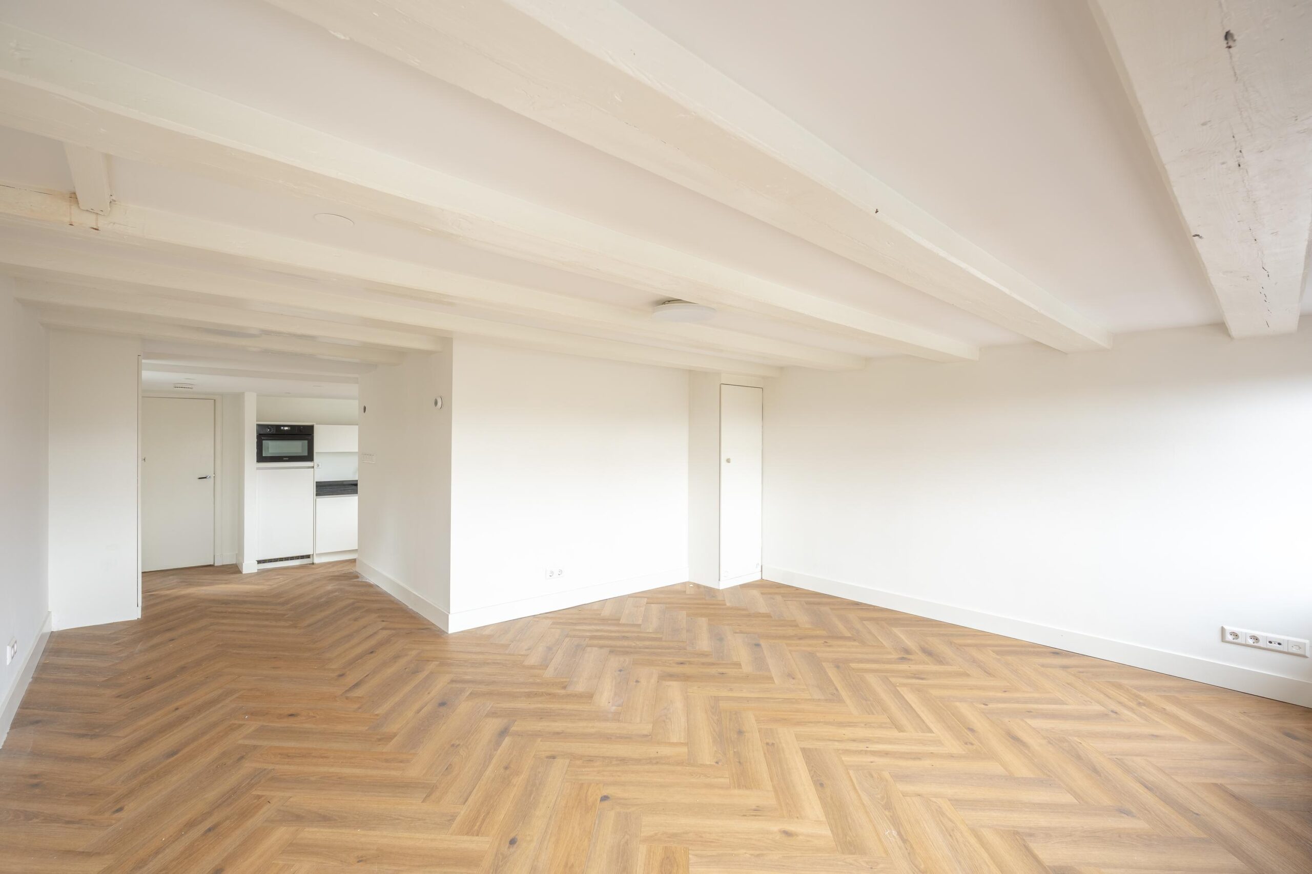 – De plafondhoogten in de woonkamer aan de voorzijde zijn circa 1.75 m onder de balk en circa 1.85 m tussen de balk. De gesloten keuken en de slaapkamer hebben een plafondhoogte van circa 2.10 m;