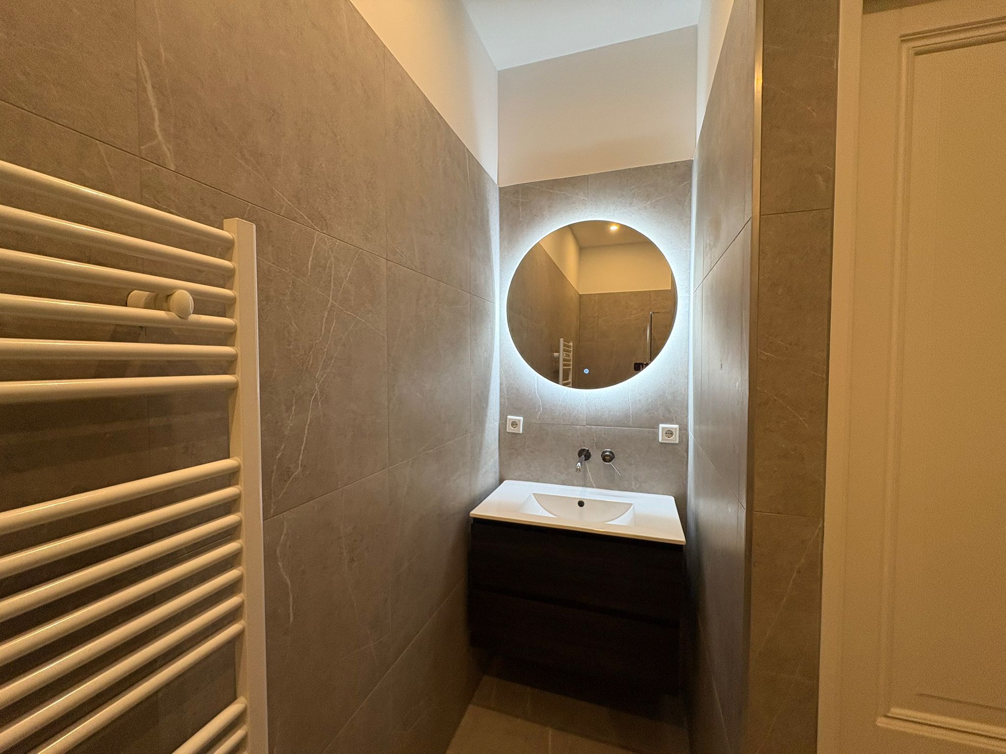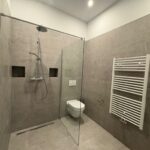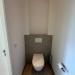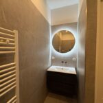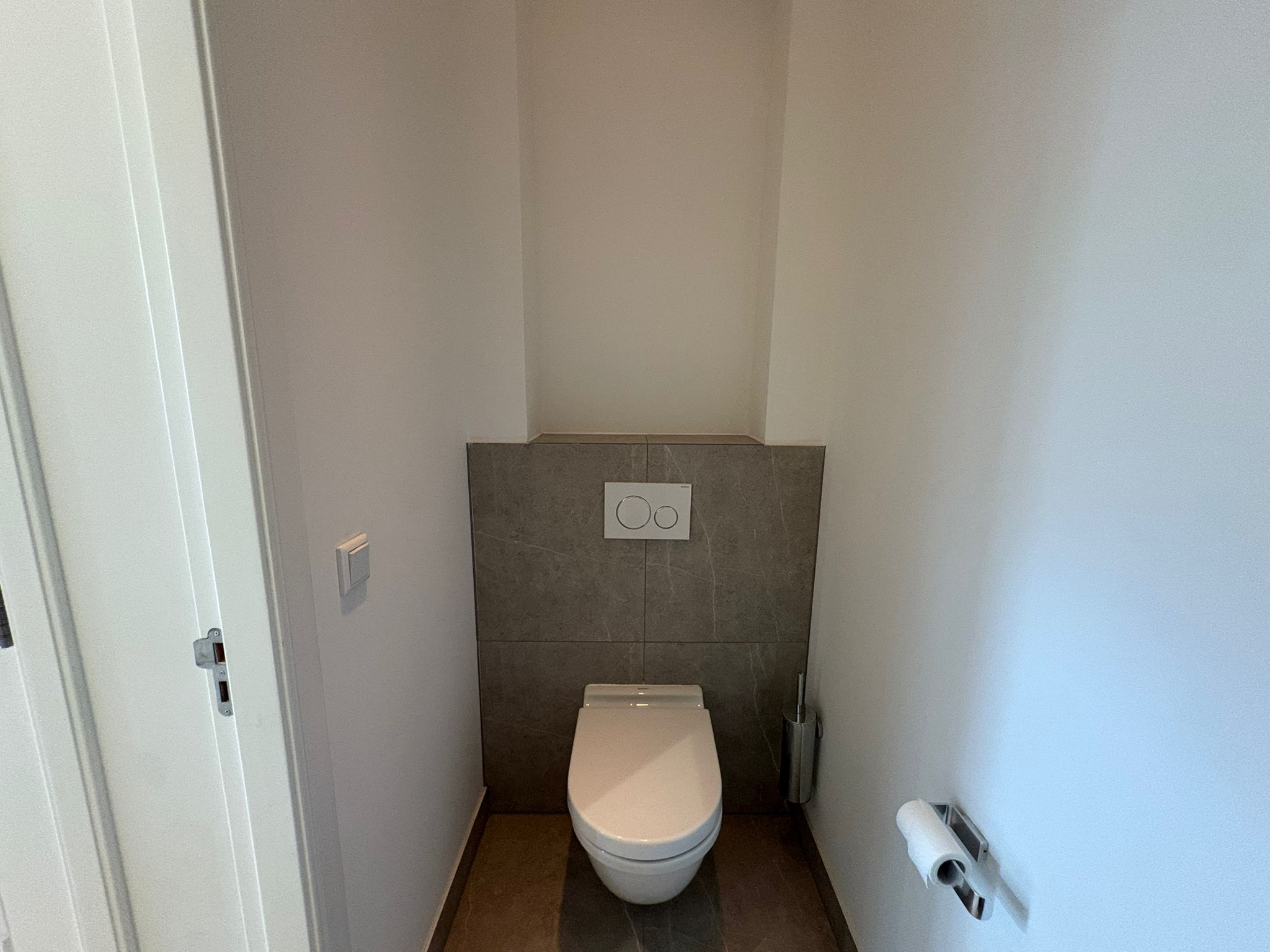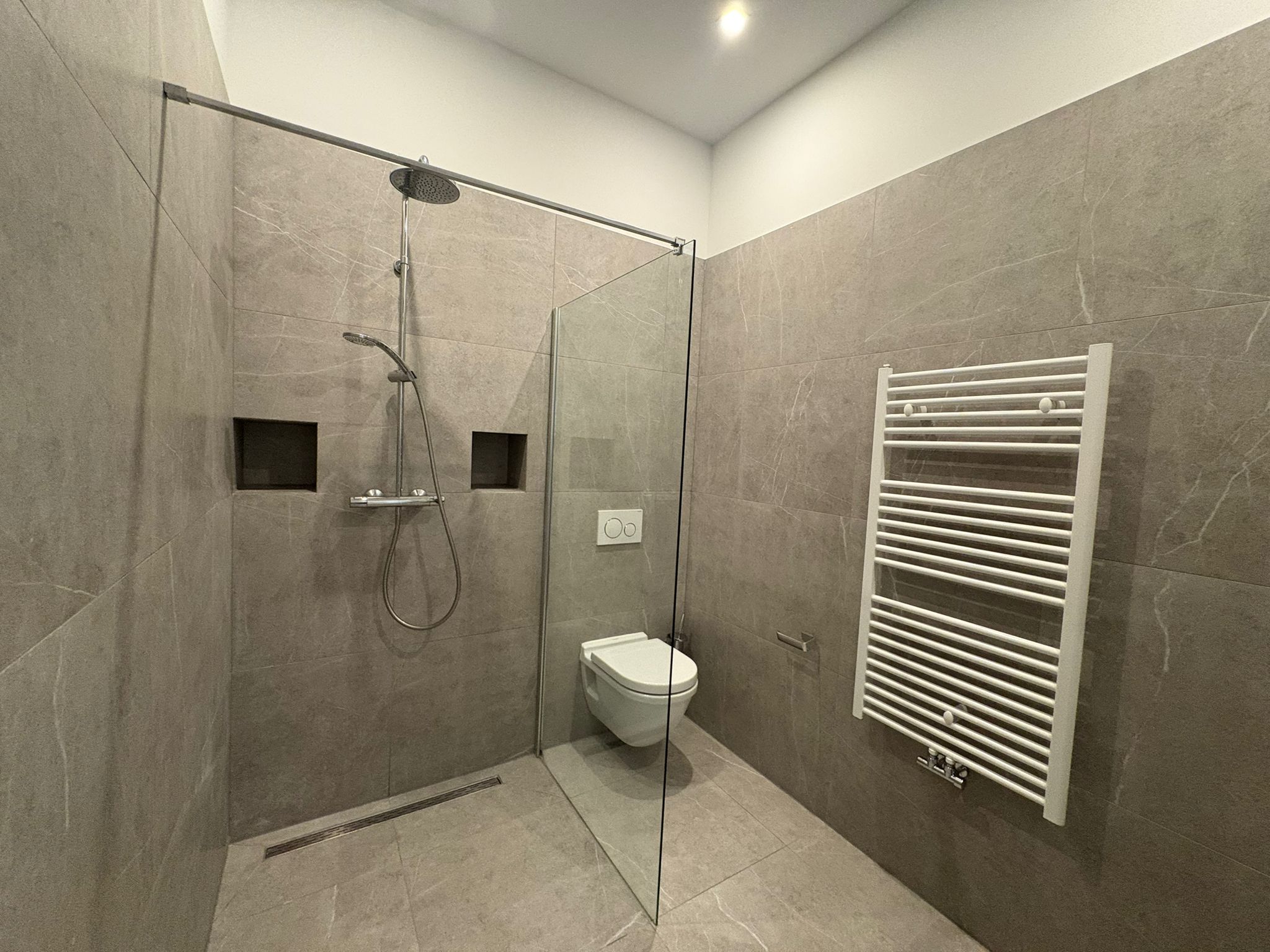 De badkamer is modern uitgevoerd en hoogwaardig afgewerkt met grote wand- en vloertegels, inbouwspots en strakke details. Er is een inloopdouche met regendouche, een tweede toilet, een fraai wastafelmeubel en een designradiator.