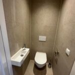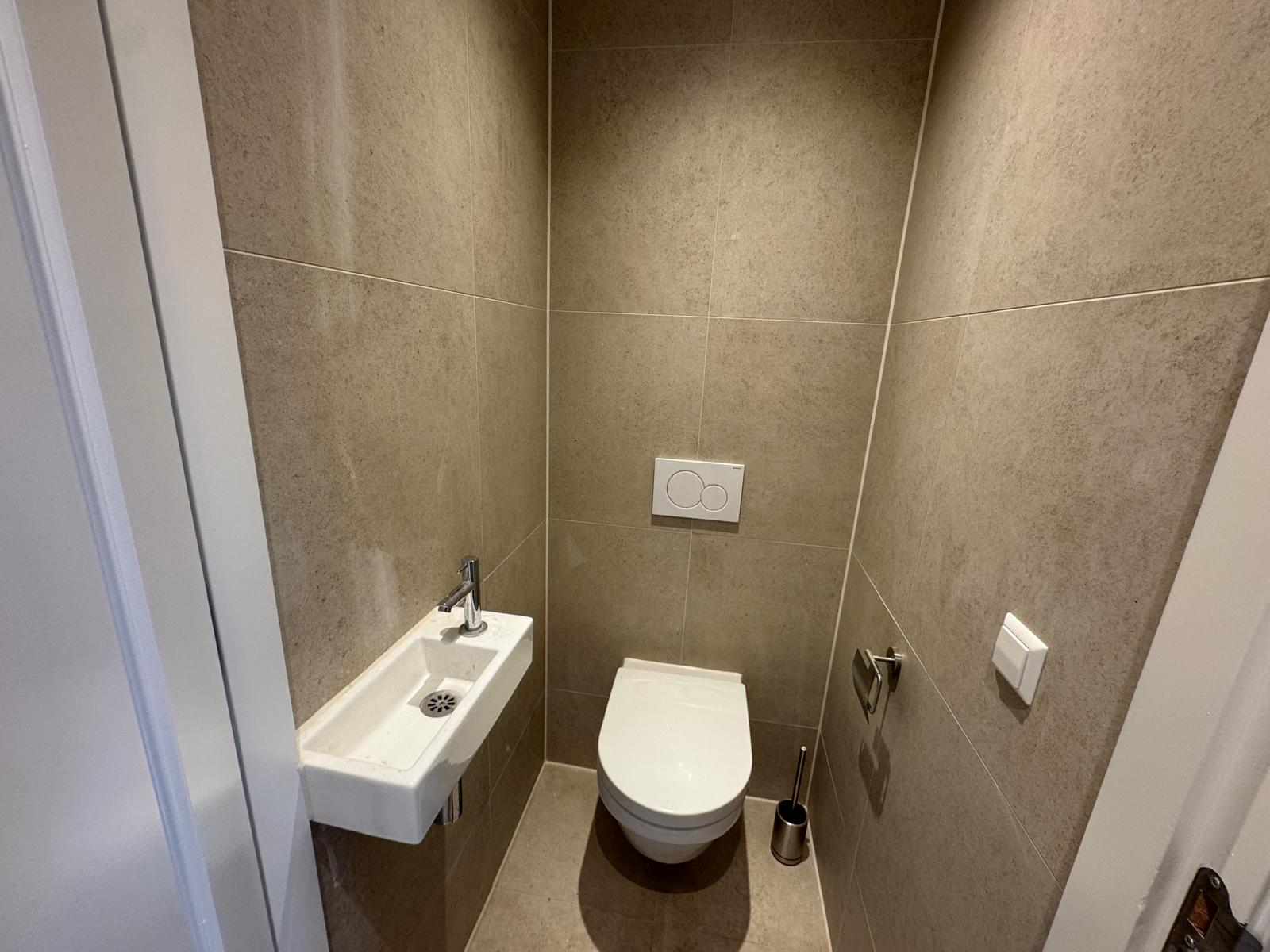 Centraal in de woning ligt de moderne badkamer, voorzien van een inloopdouche en wastafelmeubel. Het separate toilet is in dezelfde stijl afgewerkt en bevindt zich naast de badkamer.