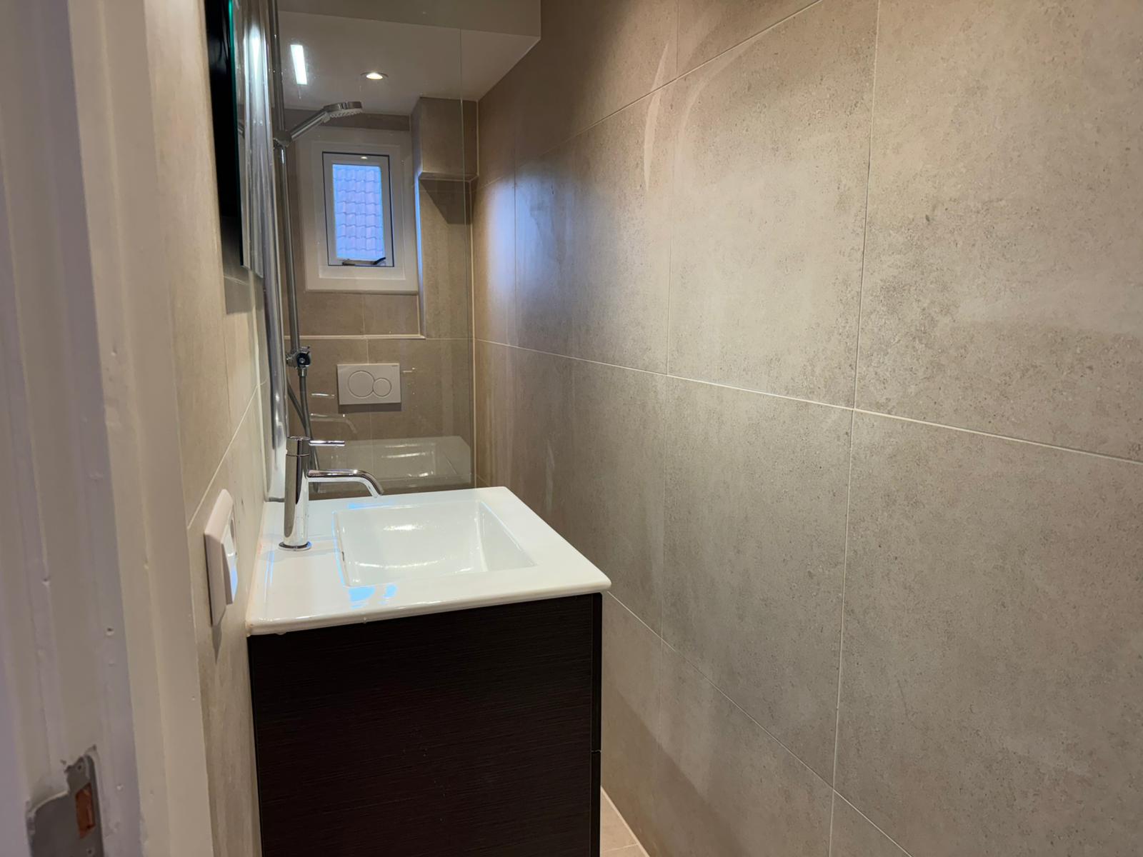 De badkamer is modern afgewerkt en voorzien van een inloopdouche en wastafelmeubel en toilet.
