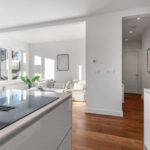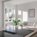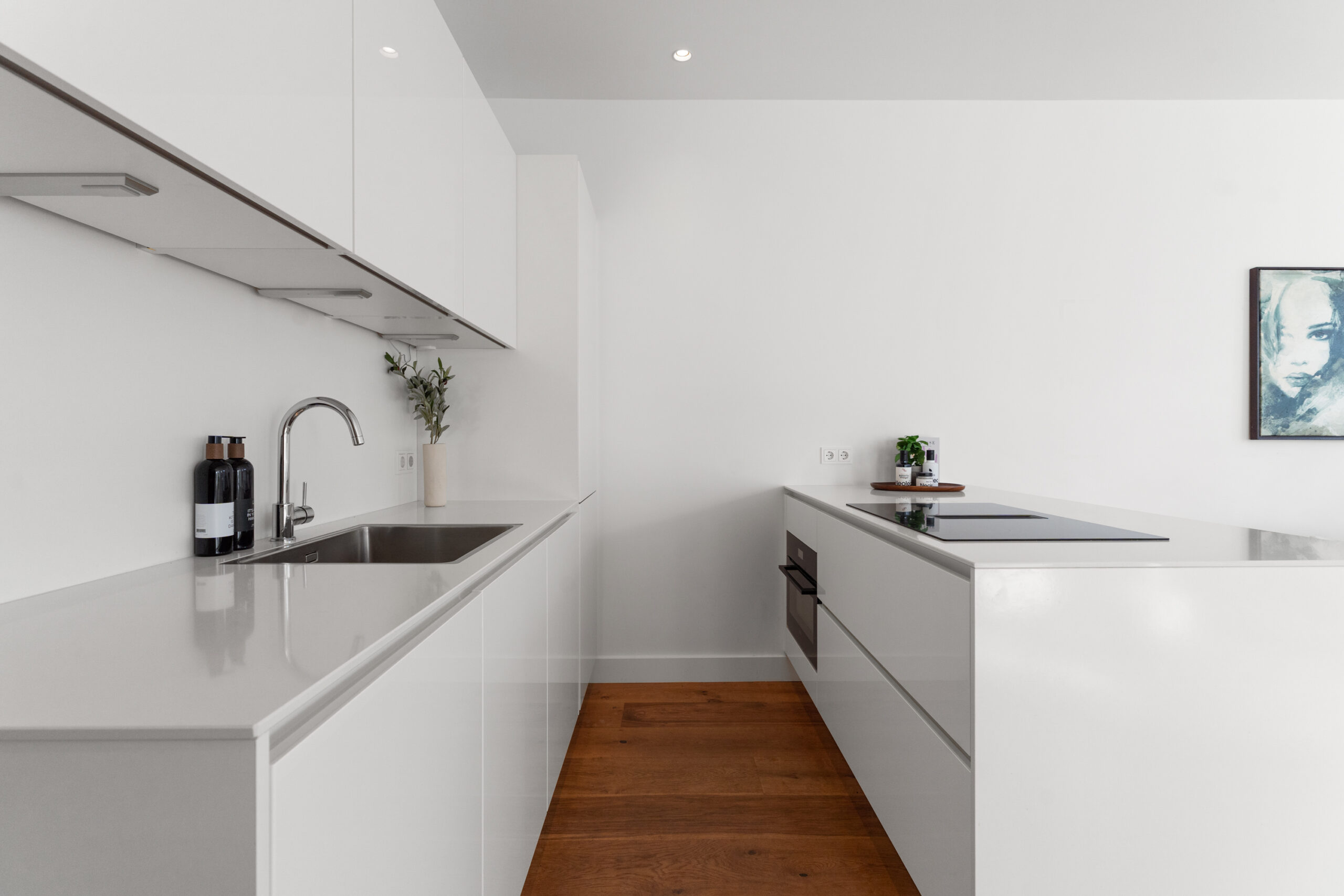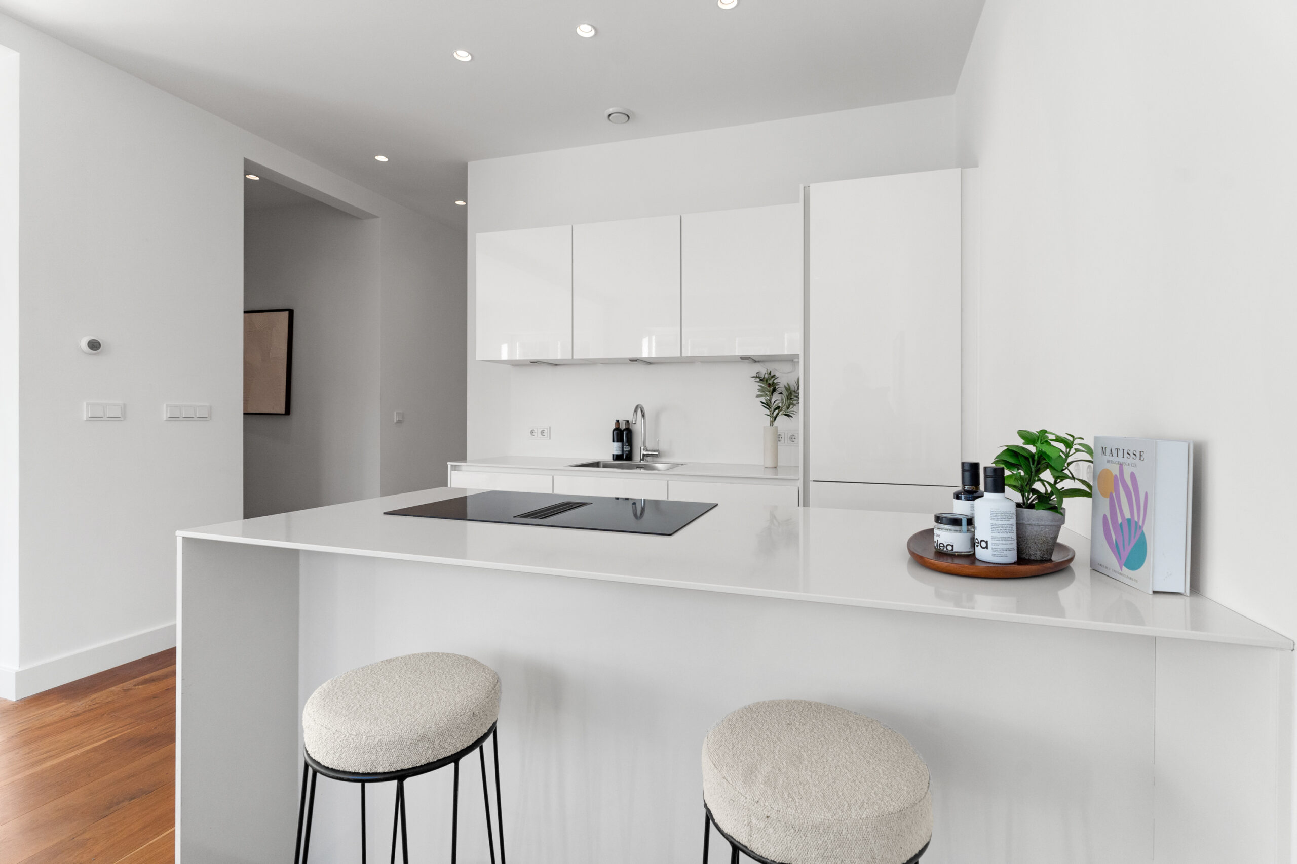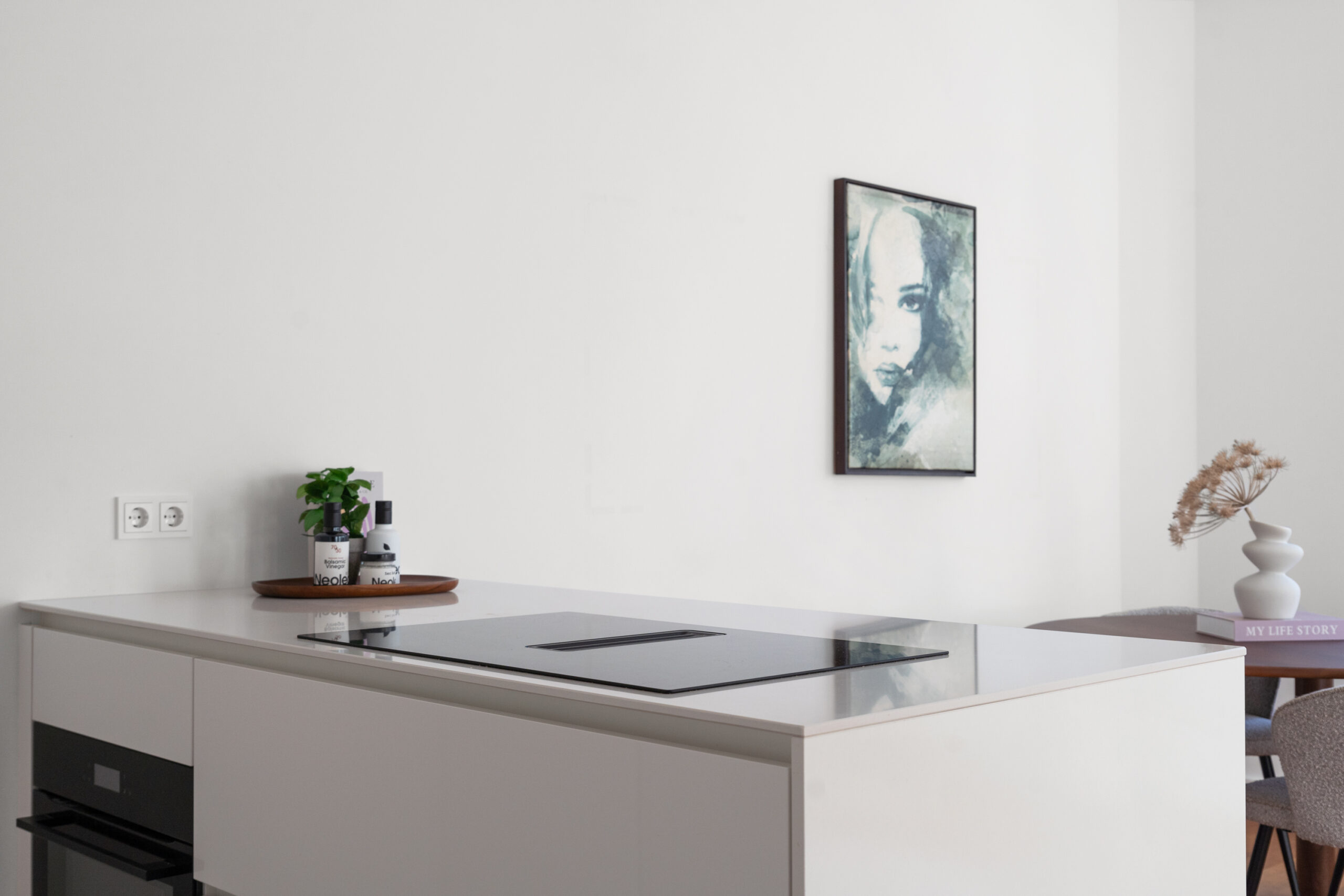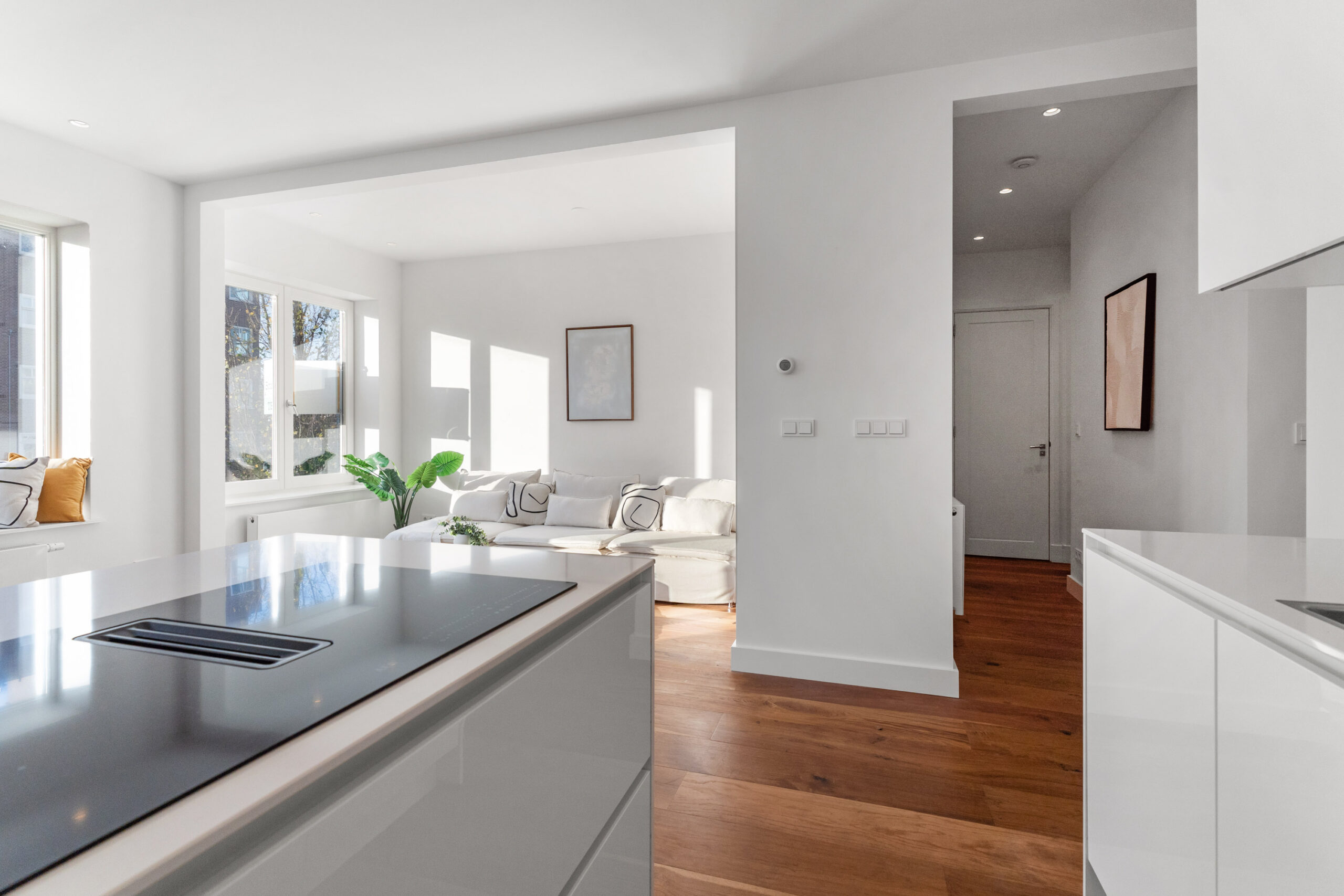 De ruime woonkamer aan de voorzijde gelegen met grote raampartijen zorgen voor veel lichtinval. Luxe keuken met eiland en alle benodigde inbouwapparatuur van het merk AEG.