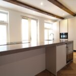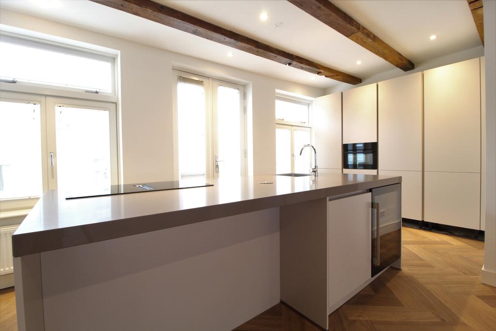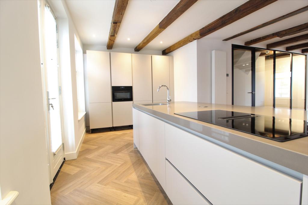 Middels het gemeenschappelijke trappenhuis bereikt u de eigen opgang van het appartement op de tweede etage. De ruime hal geeft toegang tot een separate toiletruimte en de lichte doorzon woonkamer met open keuken. Aan de voorzijde treft u het zitgedeelte. Aan de achterzijde bevindt zich de luxe open keuken met spoel/kookeiland en diverse inbouwapparatuur zoals een 4-pits inductie kookplaat met ingebouwde afzuiging, een koelkast, vriezer, vaatwasser, een combi oven/magnetron, een wijnklimaatkast en een natuurstenen werkblad. Alle keukenapparatuur is van het merk AEG.