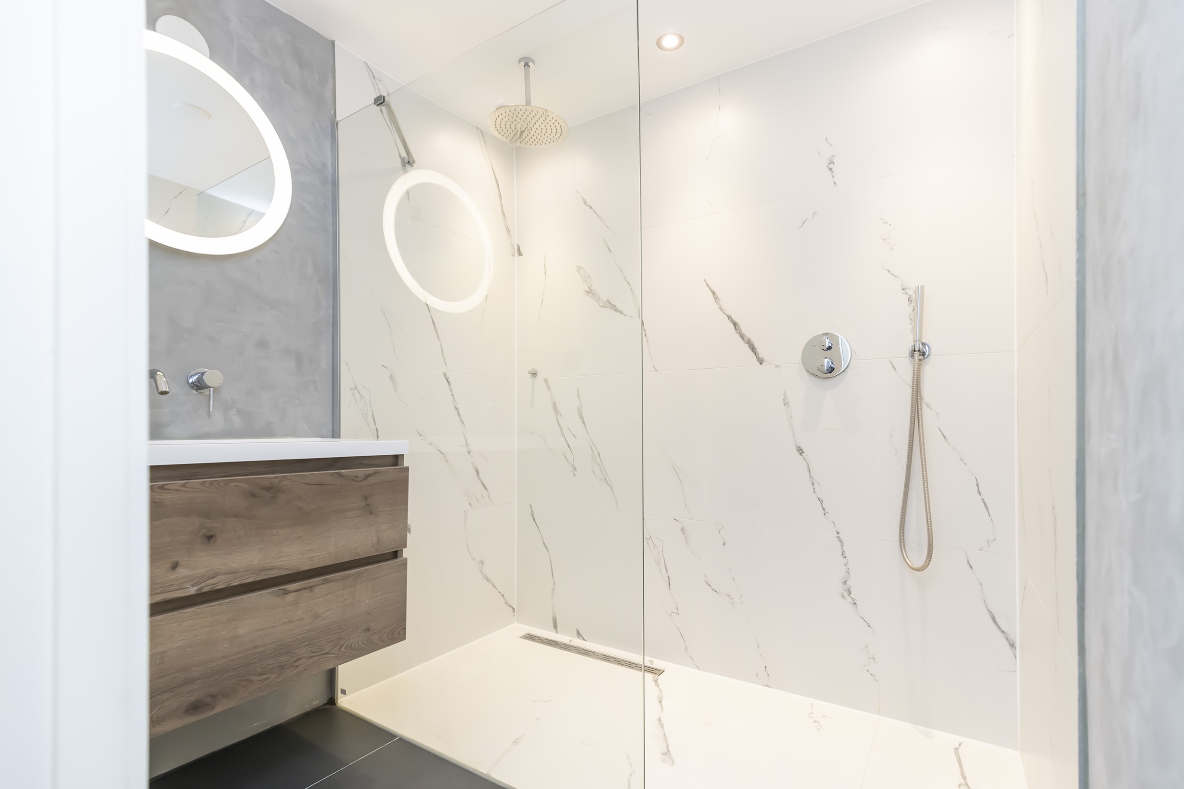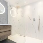 - Badkamervoorzieningen Wastafel, wastafelmeubel, inloopdouche, vloerverwarming