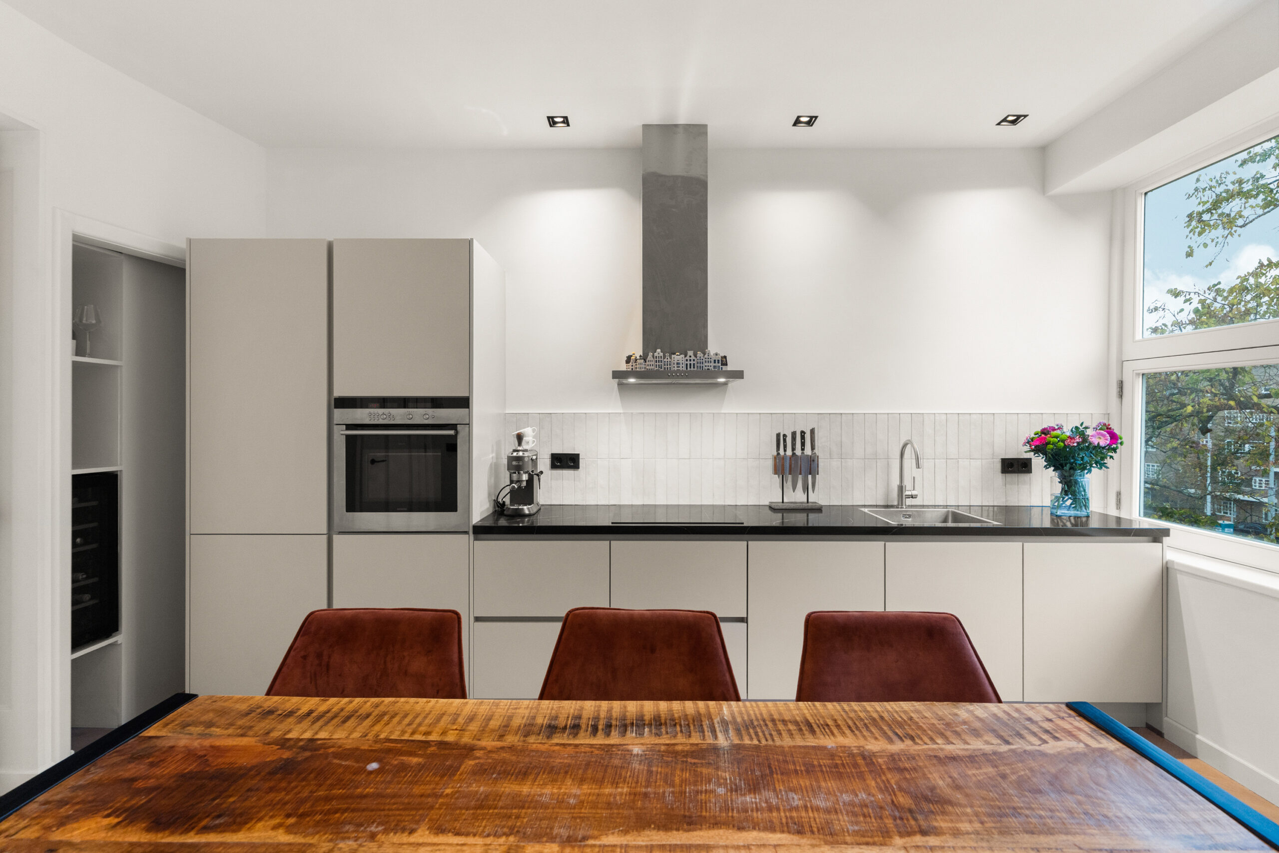 Aan de achterzijde ligt de ruime en lichte woonkamer met openslaande deuren naar het balkon op het ZUIDEN, waar je heerlijk kunt genieten van de buitenlucht. De woonkamer staat in directe verbinding met de moderne keuken, die is voorzien van moderne apparatuur.