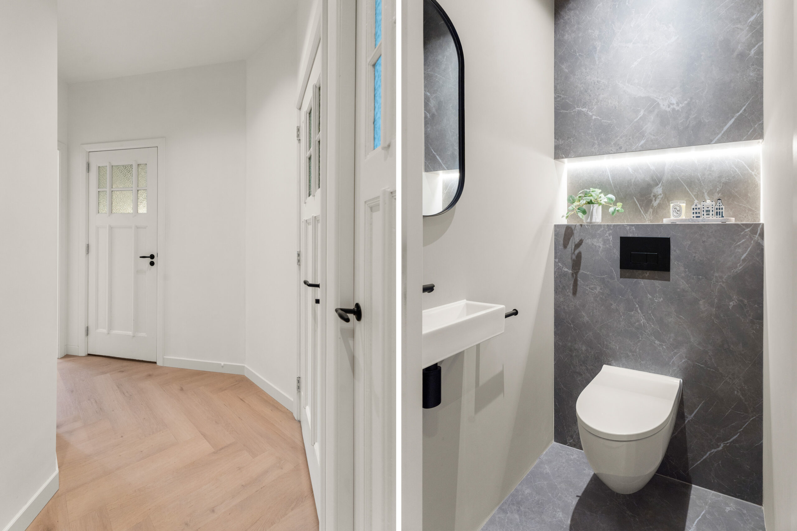 Daarnaast is er een aparte toiletruimte met fontein en een kamer aan de voorzijde die uitstekend dienst kan doen als werkkamer of logeerkamer, hierin bevinden zich de cv-installatie en meterkast.